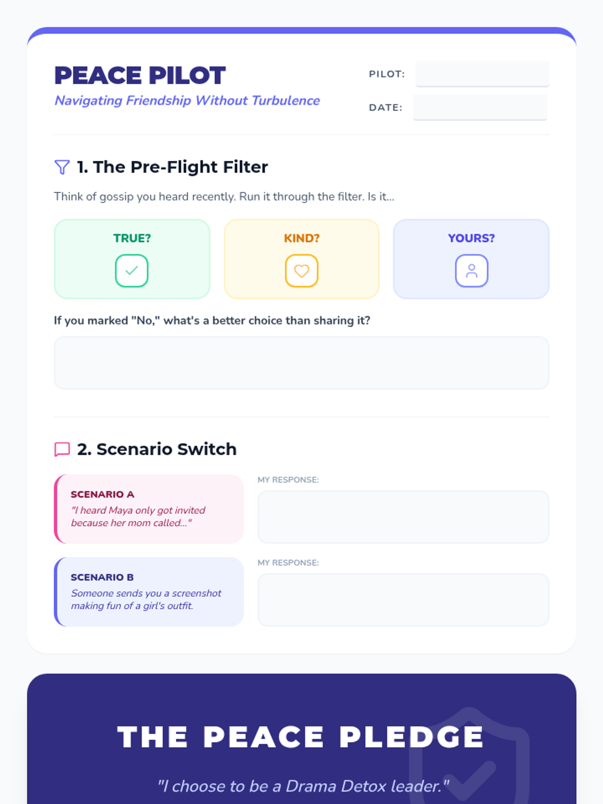 A student-facing worksheet for practicing drama-exit strategies. Includes a 'gossip filter' activity, scenario-based response practice, and a personal 'Peace Pledge' commitment to foster respect within their social circles.