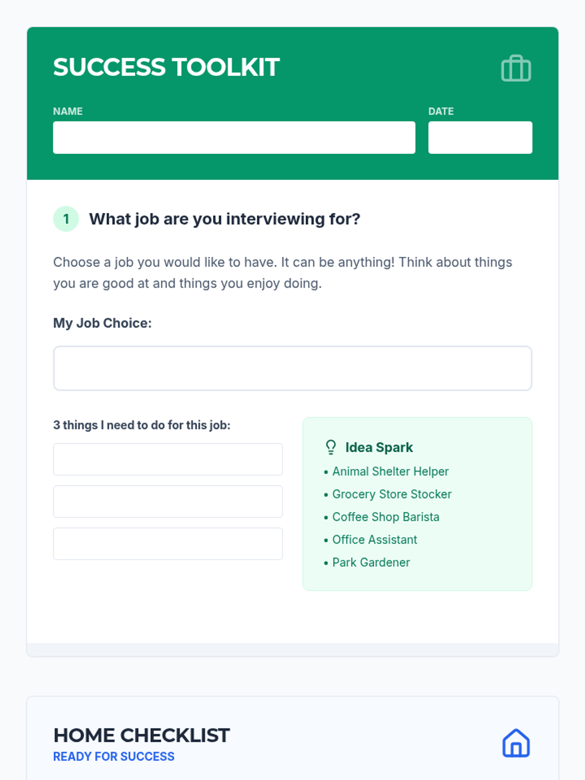 A 3-page student packet including a job selection worksheet, an interview readiness checklist with success tips, and a collaborative question preparation sheet.