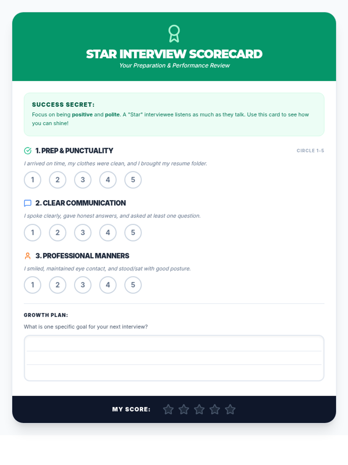 A student-friendly visual rubric for self-assessment or peer feedback after a mock interview, focusing on appearance, communication, and body language.