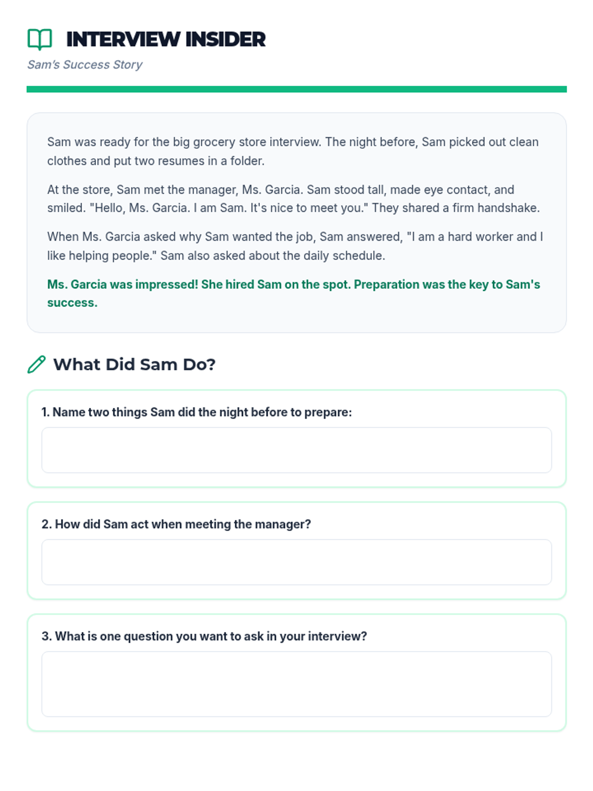 A 1-page reading passage featuring a successful interview story with follow-up reflection questions to help students identify positive interview behaviors.