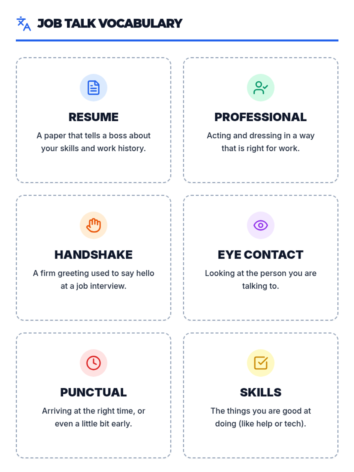 A set of six visual vocabulary cards for key interview terms (Resume, Professional, Handshake, Eye Contact, Punctual, Skills) with simple definitions.