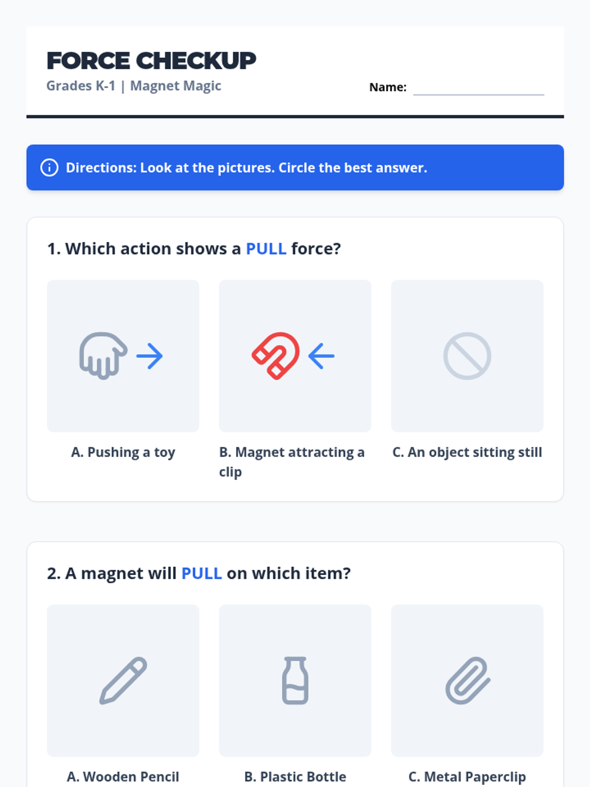 A 3-question visual assessment for K-1 students covering push/pull forces and magnetic properties, formatted to introduce early test-taking skills.