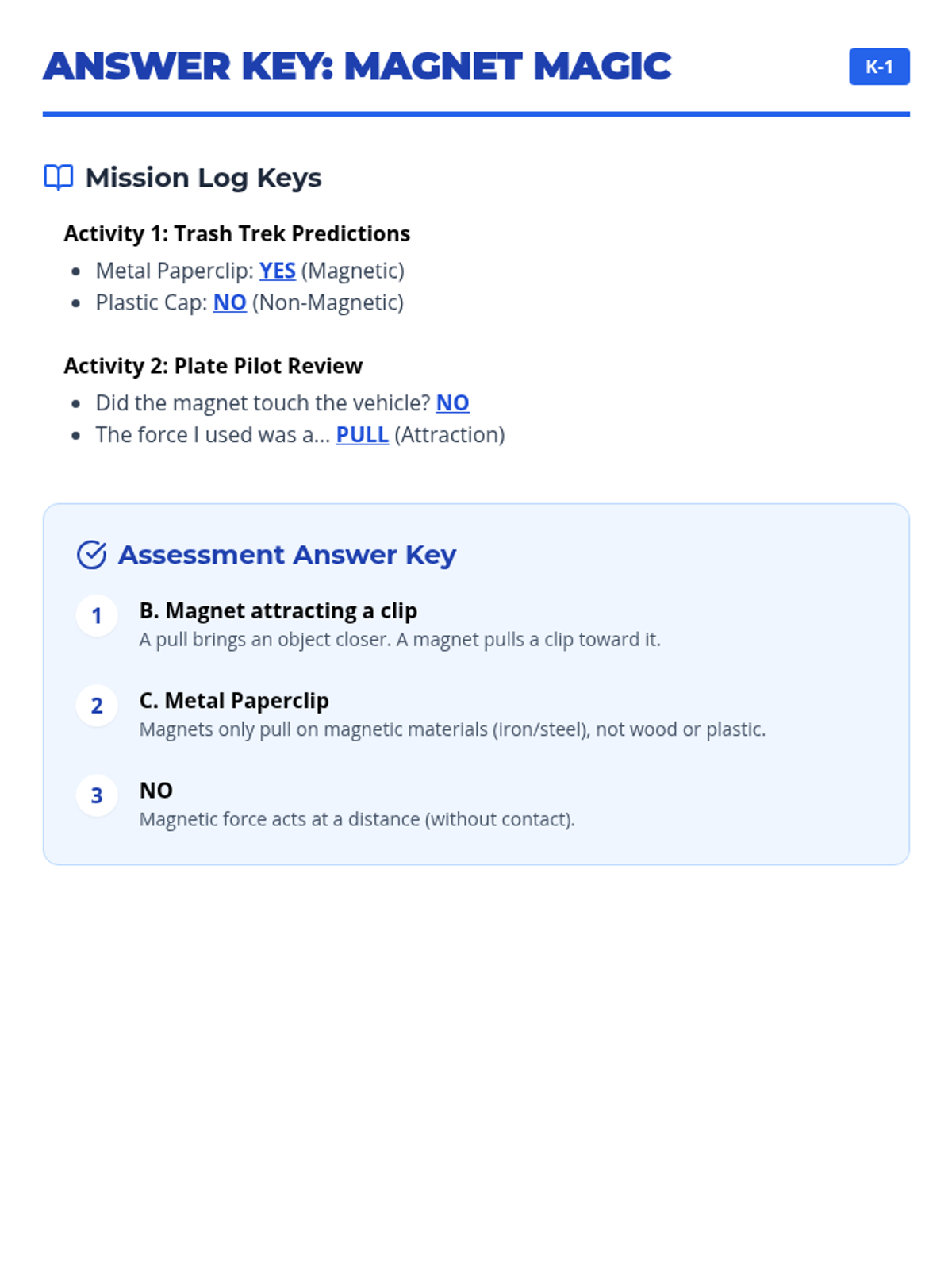 Answer key for the K-1 Magnet Magic lesson, providing solutions for the Mission Log and the STAAR Prep Assessment.