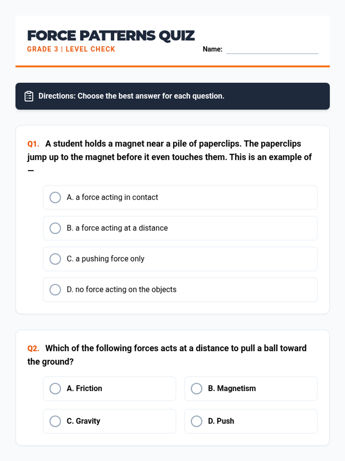 A 4-question assessment for 2nd and 3rd grade students focusing on contact vs. distance forces, including multiple choice and short answer formats.