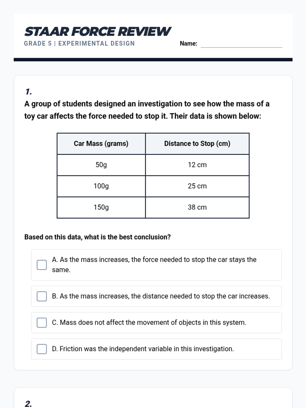 A 3-question STAAR-aligned assessment for 4th and 5th grade students covering experimental design, data table analysis, variables, and force systems.