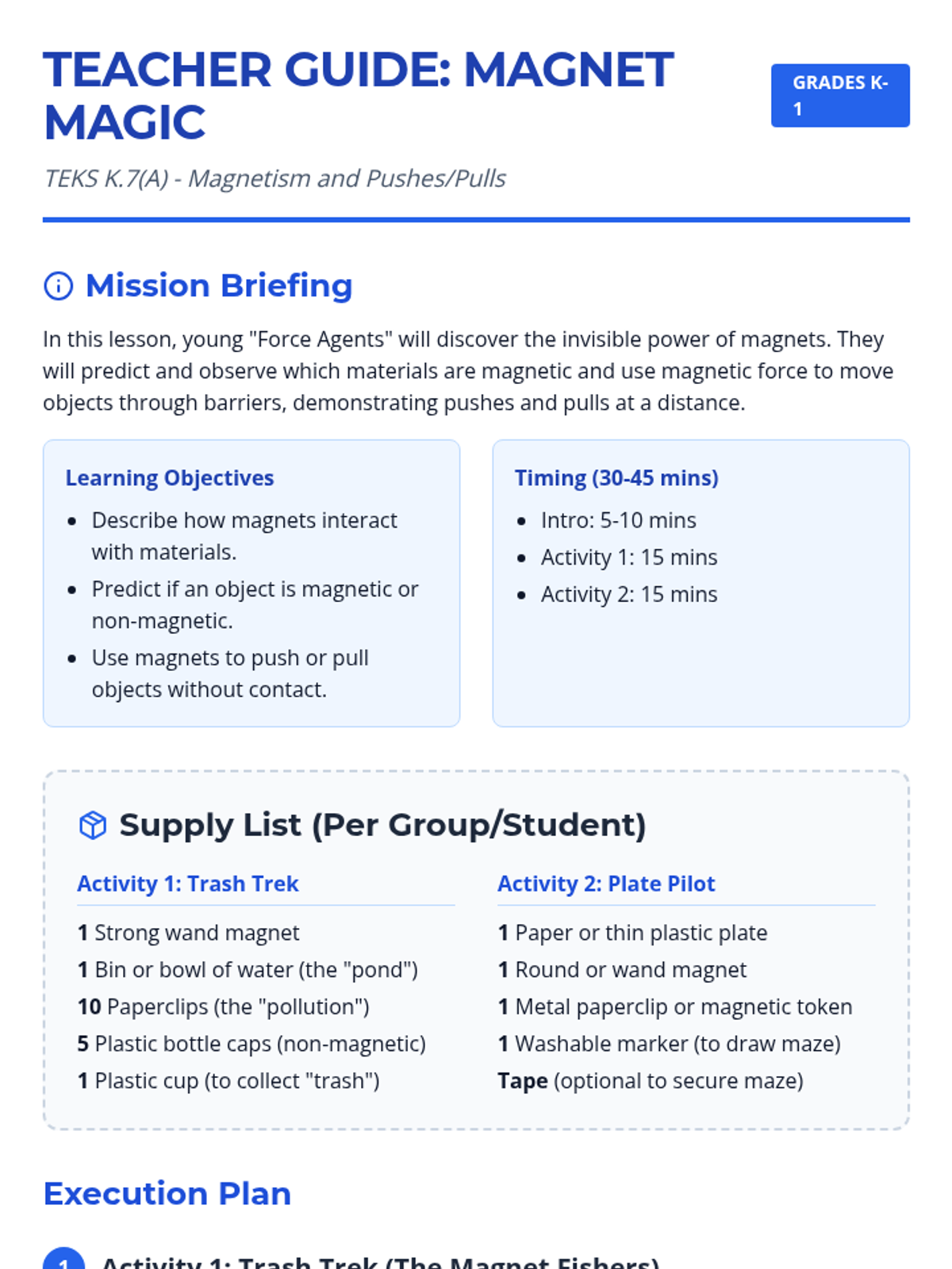 A detailed instructional guide for teachers covering two K-1 magnetism activities, including supply lists, step-by-step procedures, and an answer key for check-for-understanding questions.