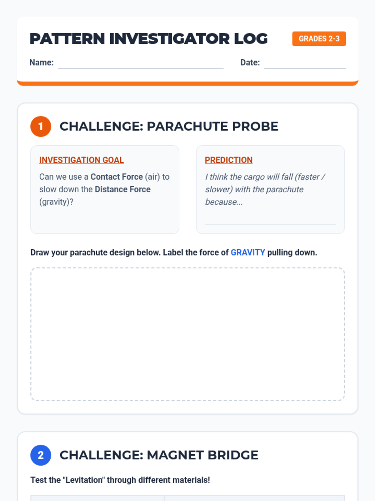 A mission log for 2nd and 3rd grade students to record predictions, sketches, and experimental results for the parachute and magnet bridge challenges.