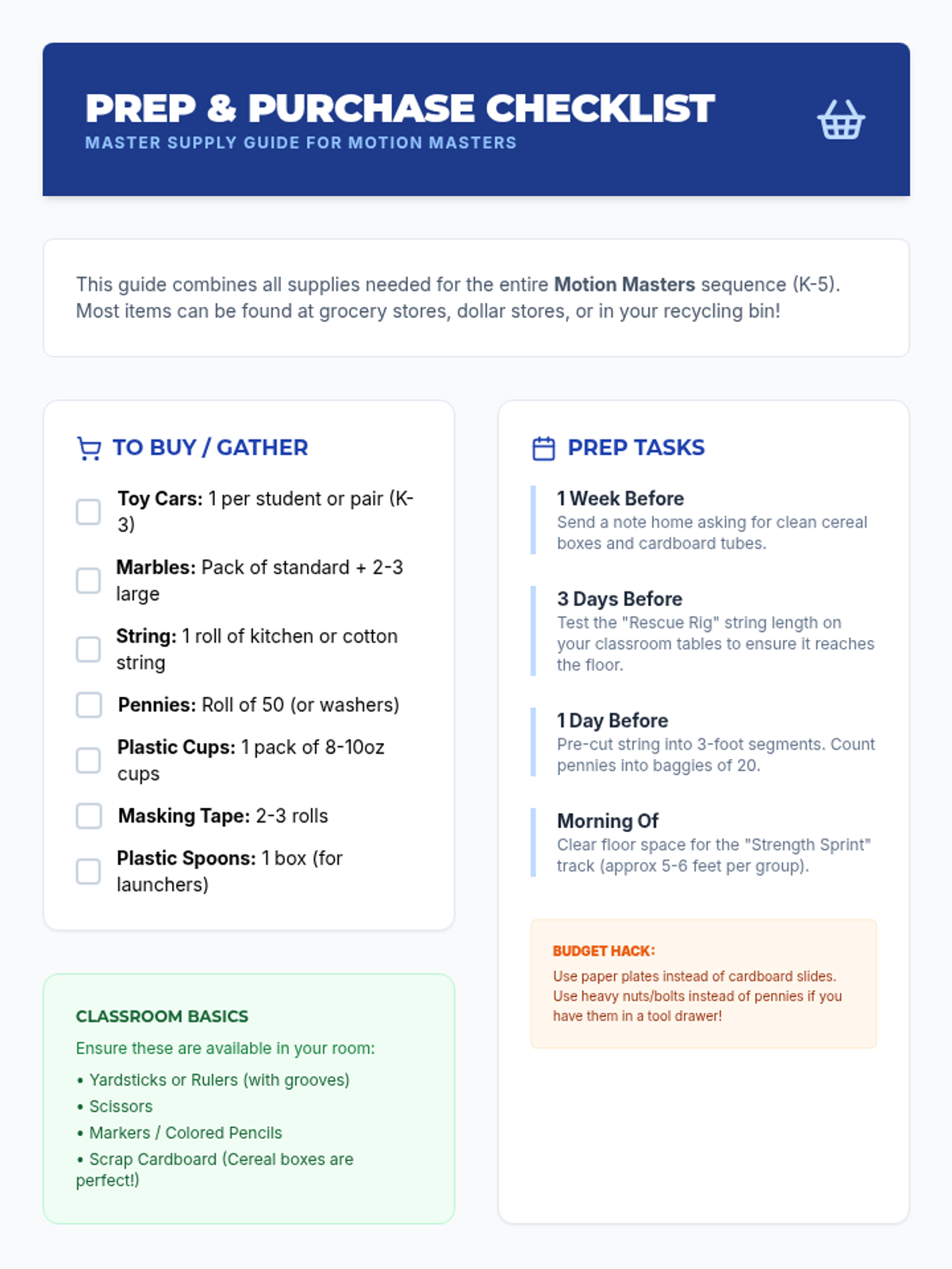 A master supply checklist and preparation guide for teachers, including a shopping list, classroom basics, and a timeline for material preparation.