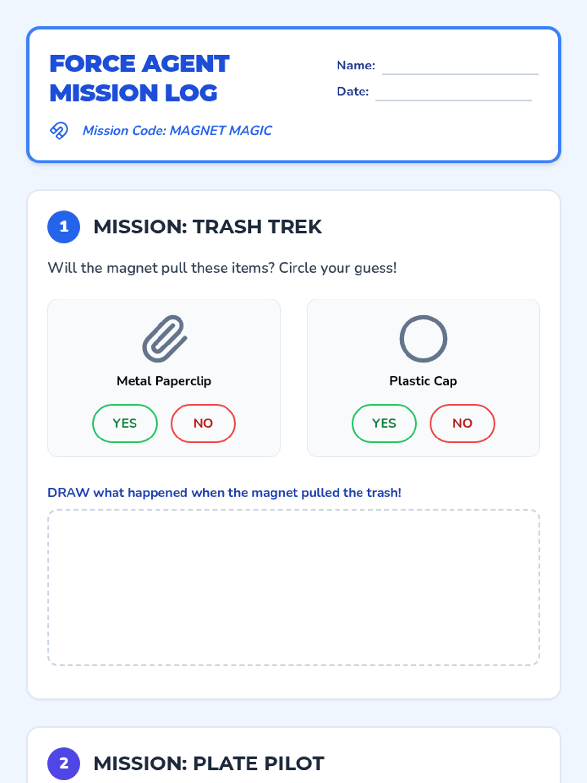 A simple activity log for K-1 students to record predictions and observations during the "Trash Trek" and "Plate Pilot" magnetism missions.