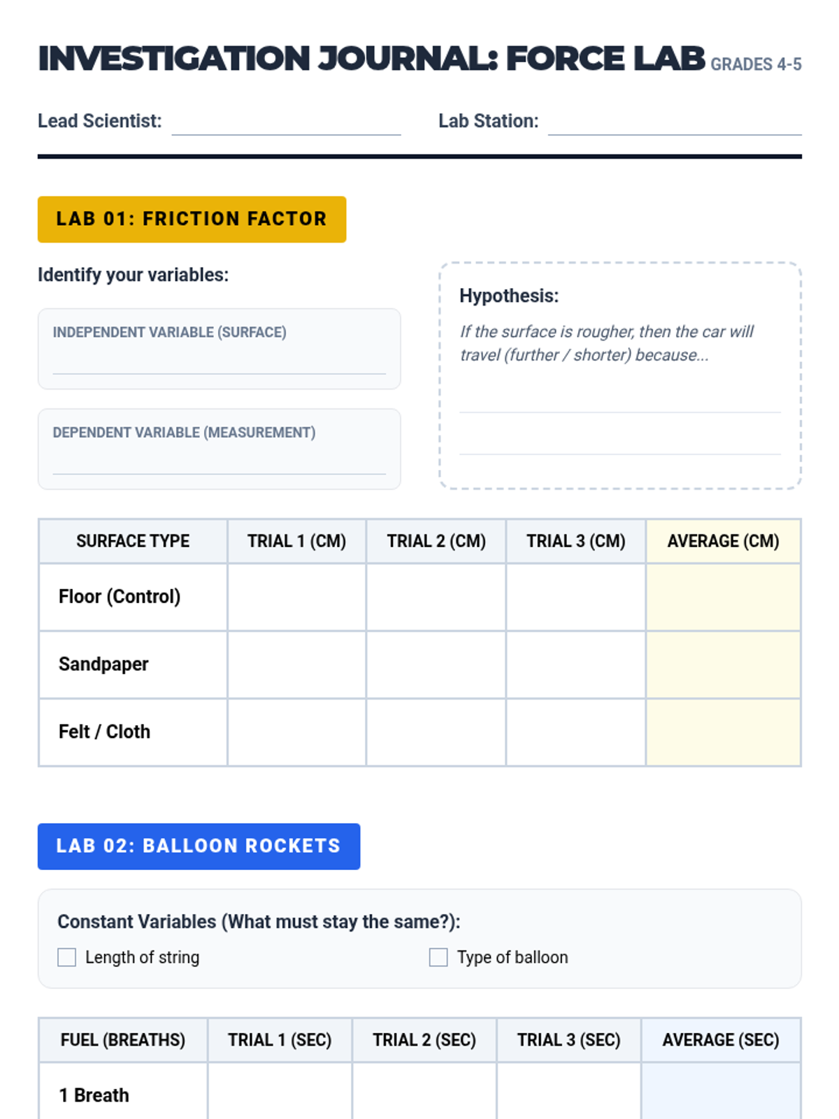 A professional investigation journal for 4th and 5th grade students to record hypotheses, data, and conclusions for friction and rocket labs.