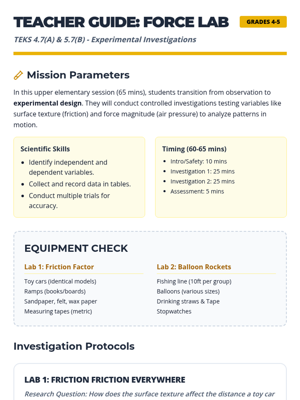 A teacher's instructional guide for 4th and 5th grade force investigations, featuring friction and balloon rocket experimental designs with detailed procedures and answer keys.