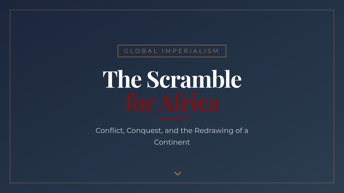 Lecture slides for the Scramble for Africa, covering motives (The Three Gs), the Berlin Conference, and the Congo Free State. Large text and high-contrast design for readability.