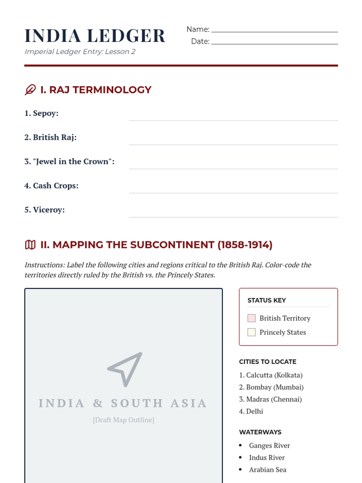 A vocabulary and map worksheet for the British Raj in India, featuring an SVG map of the subcontinent, key terms, and a cause-and-effect analysis of the Sepoy Mutiny. Optimized for handwriting with white backgrounds.