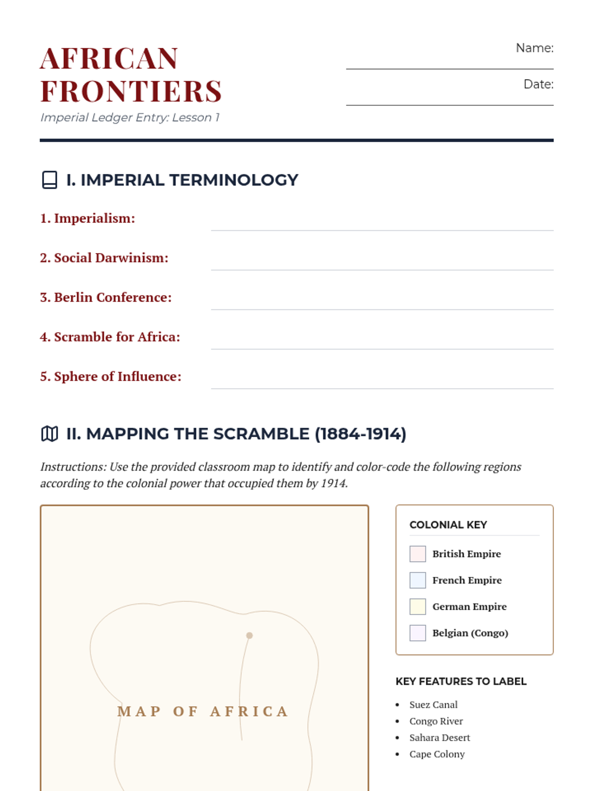 A vocabulary and mapping worksheet for the Scramble for Africa, featuring key terms, an SVG map of Africa for student use, and critical thinking questions on the Berlin Conference.