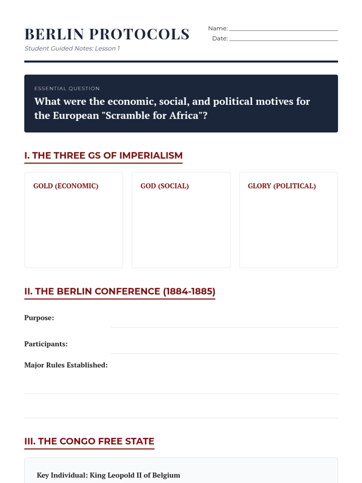 Guided lecture notes for the Scramble for Africa, providing a structured template for students to record key information about motives, the Berlin Conference, and the Congo Free State. Clear of instructional placeholders and optimized for handwriting.