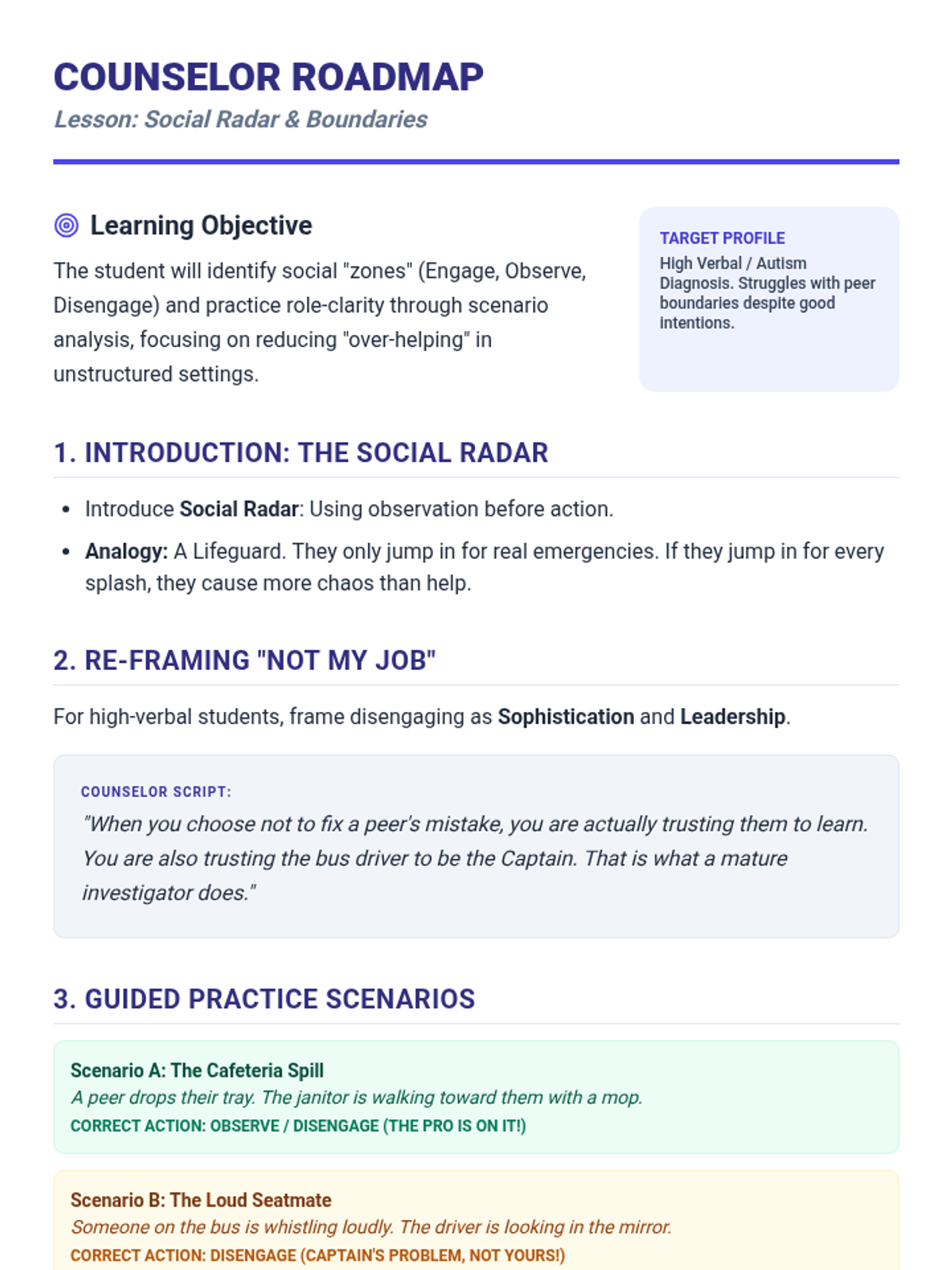 A guide for counselors or teachers to facilitate the Social Radar lesson, including instructional scripts and implementation strategies.