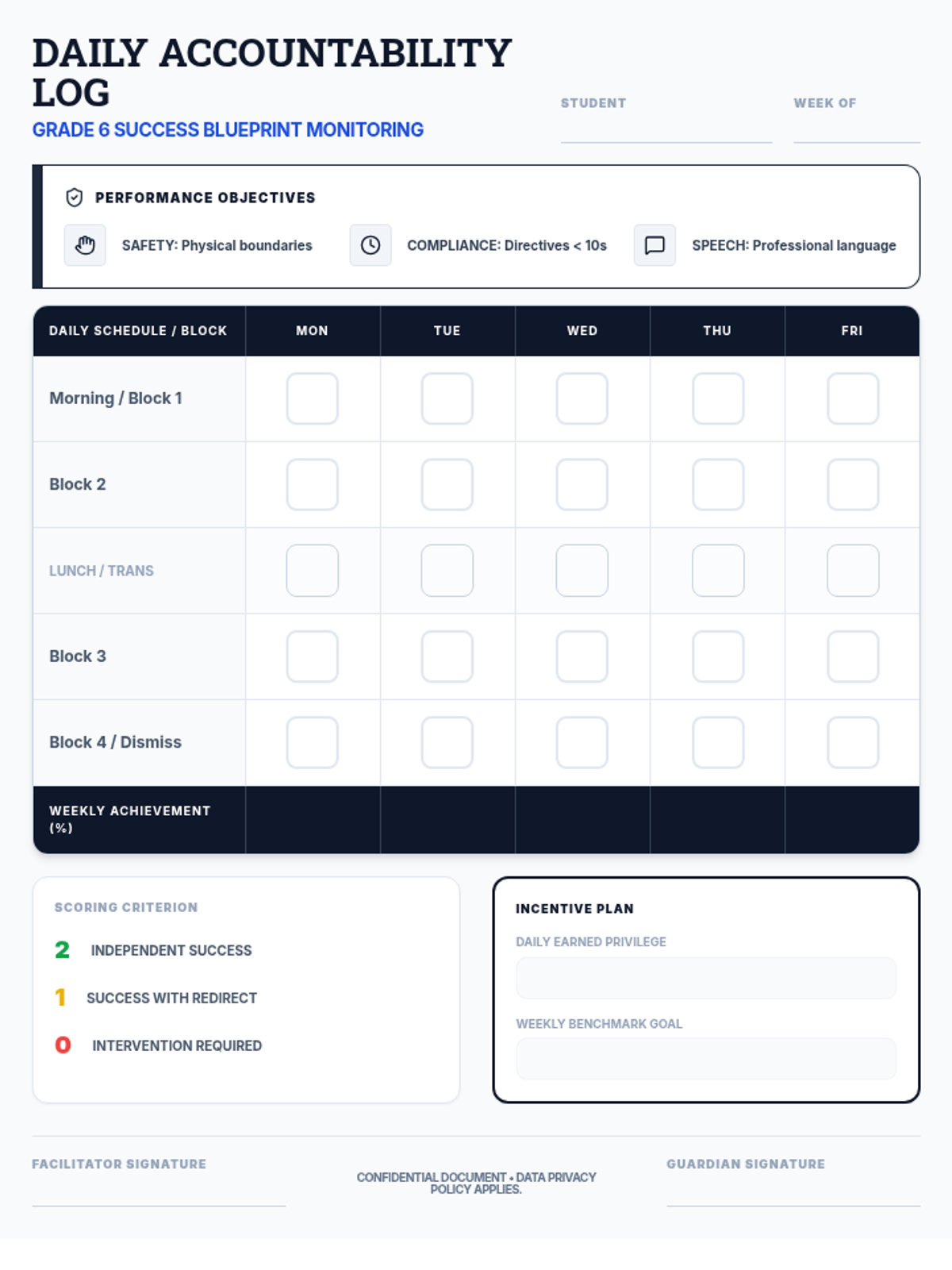 A professional-grade "Daily Accountability Log" for 6th-grade students, focusing on performance objectives, self-monitoring, and earned privileges.