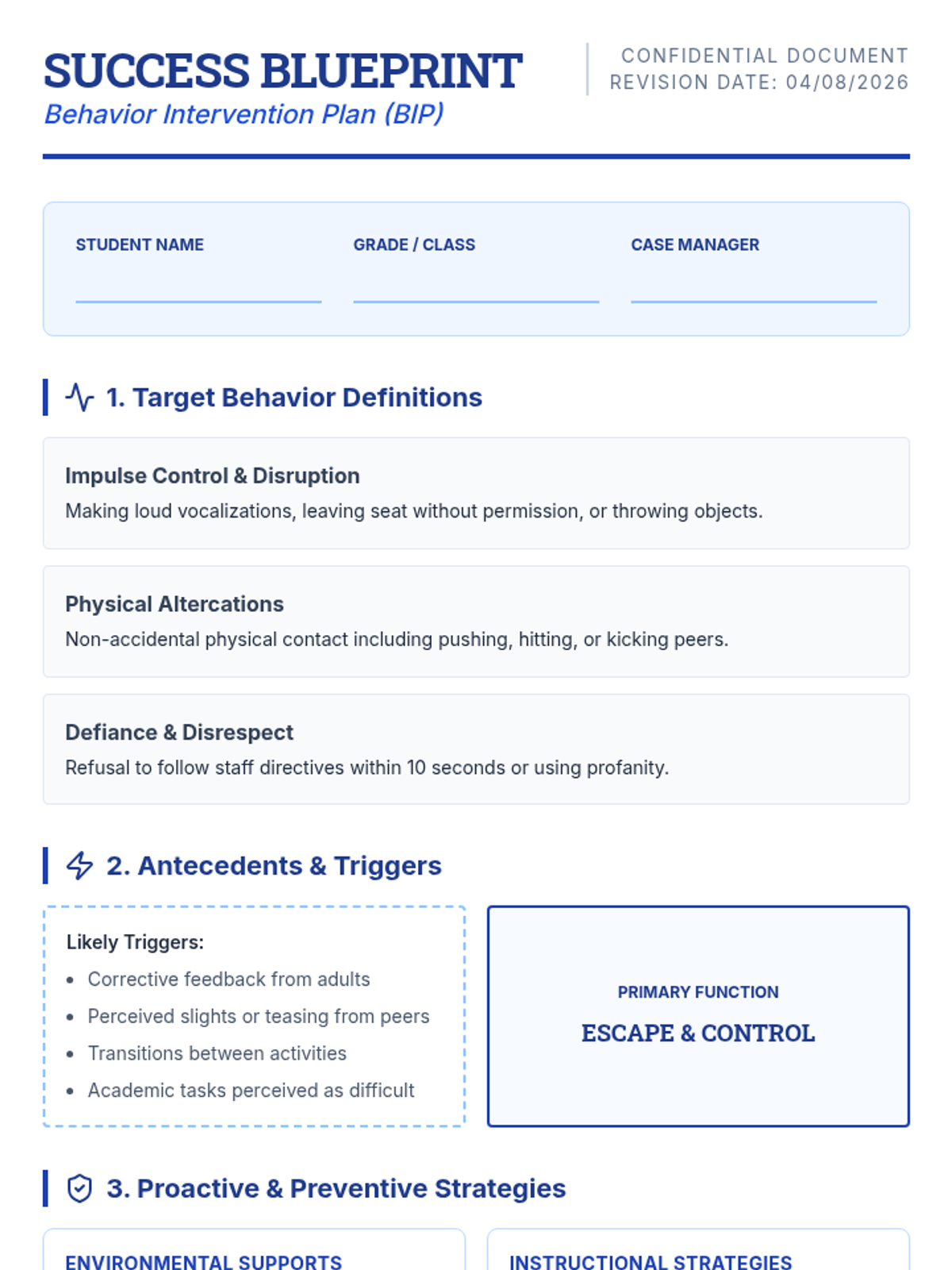 A formal Behavior Intervention Plan (BIP) document styled as a "Success Blueprint," detailing target behaviors, triggers, replacement behaviors, and a crisis response protocol.