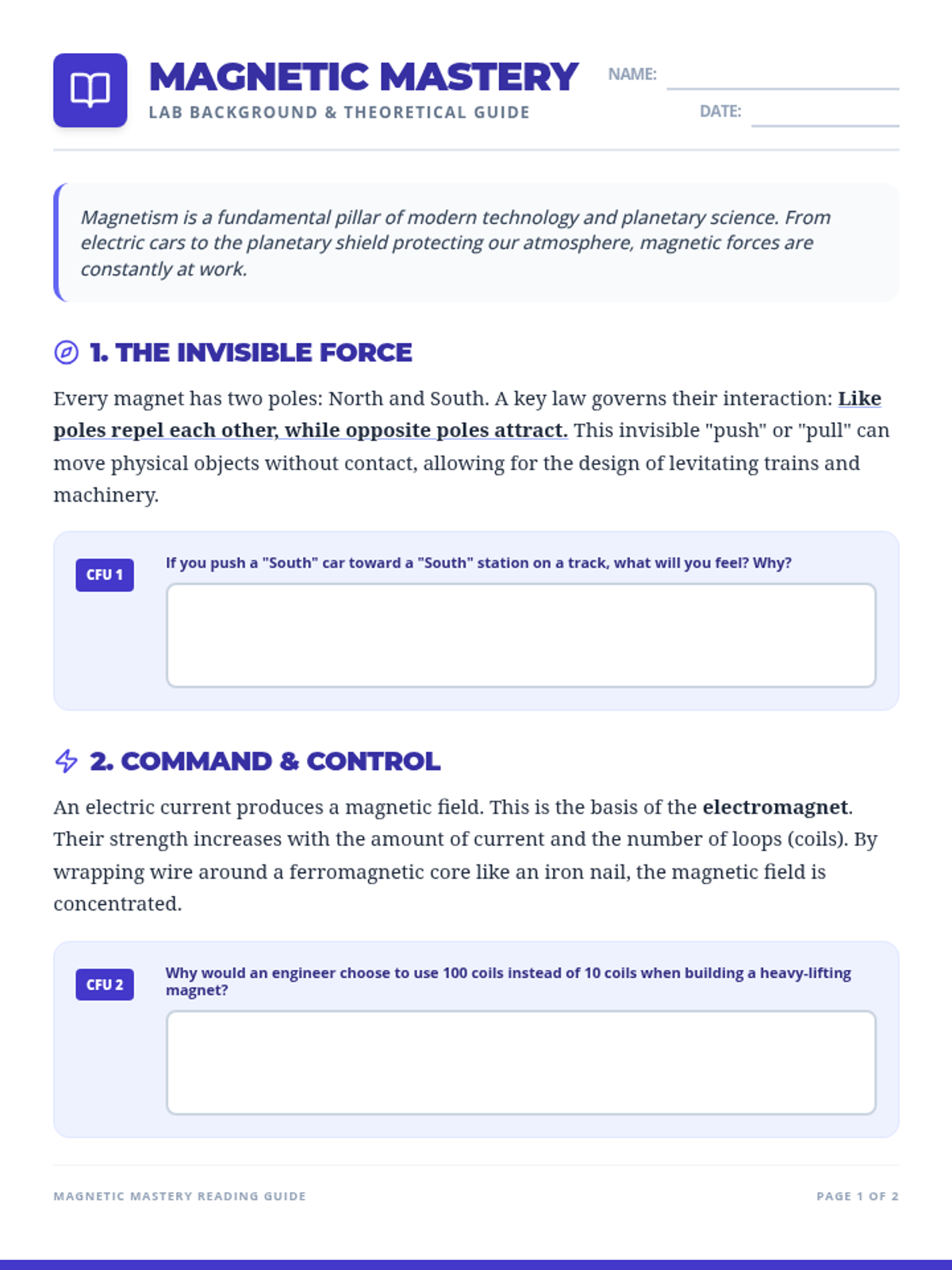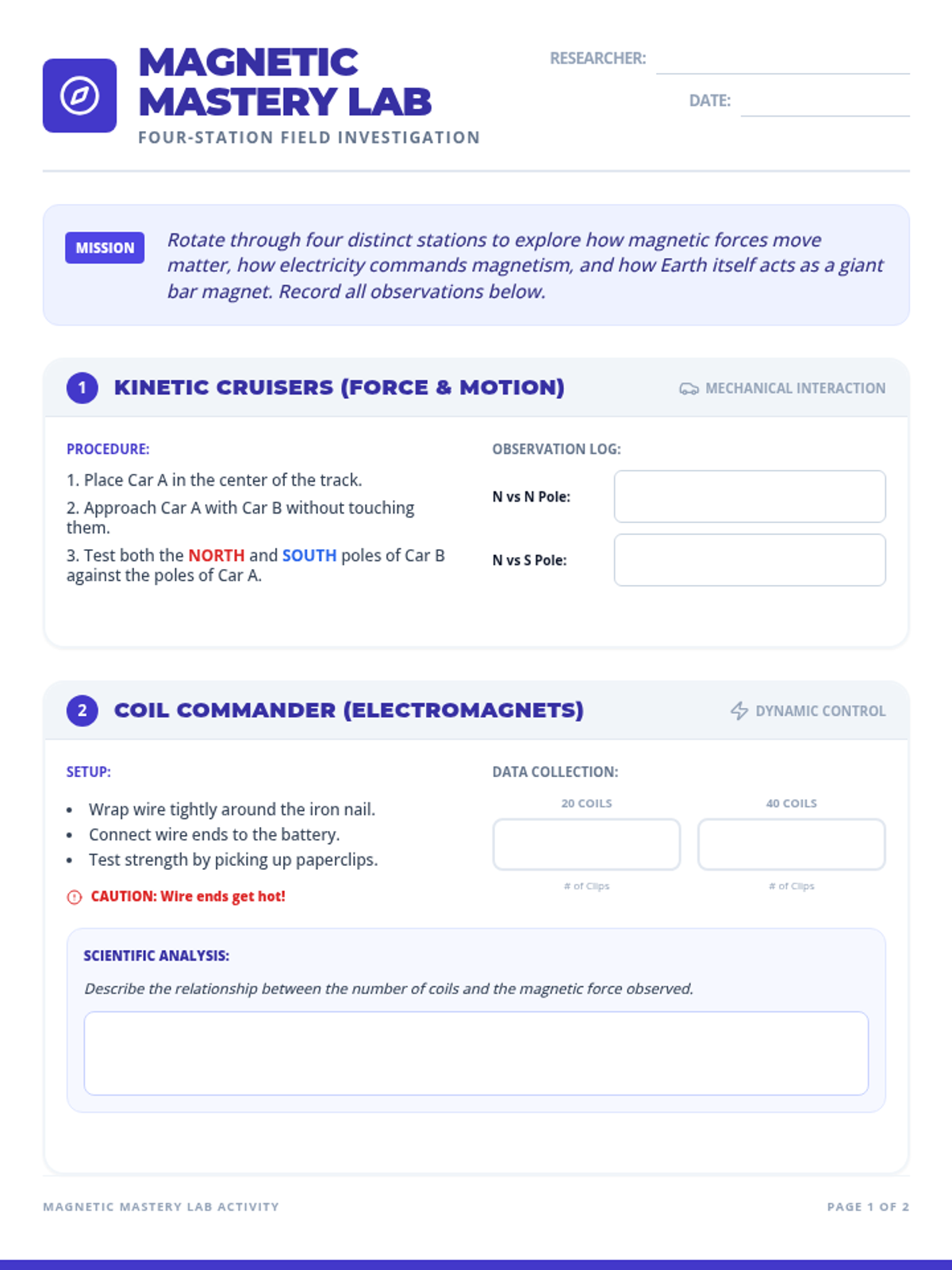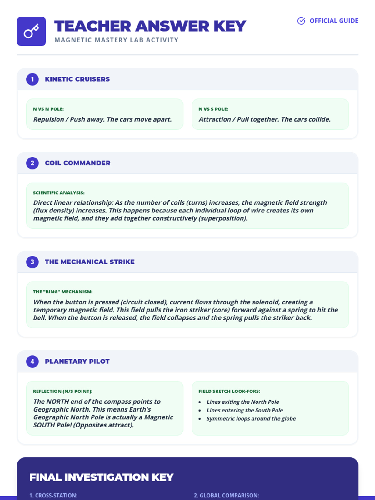 A comprehensive teacher answer key for the Magnetic Mastery Stations Lab. It provides detailed solutions for every station observation, scientific analysis of coil-to-strength ratios, engineering explanations for the doorbell striker, and Dynamo Theory evidence for Earth's magnetic field.