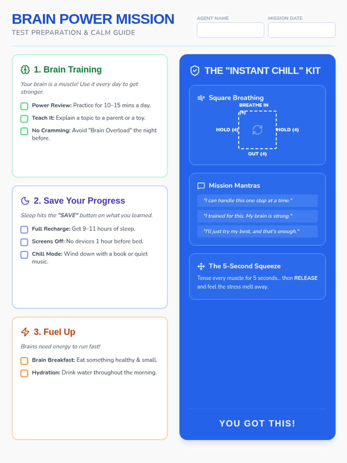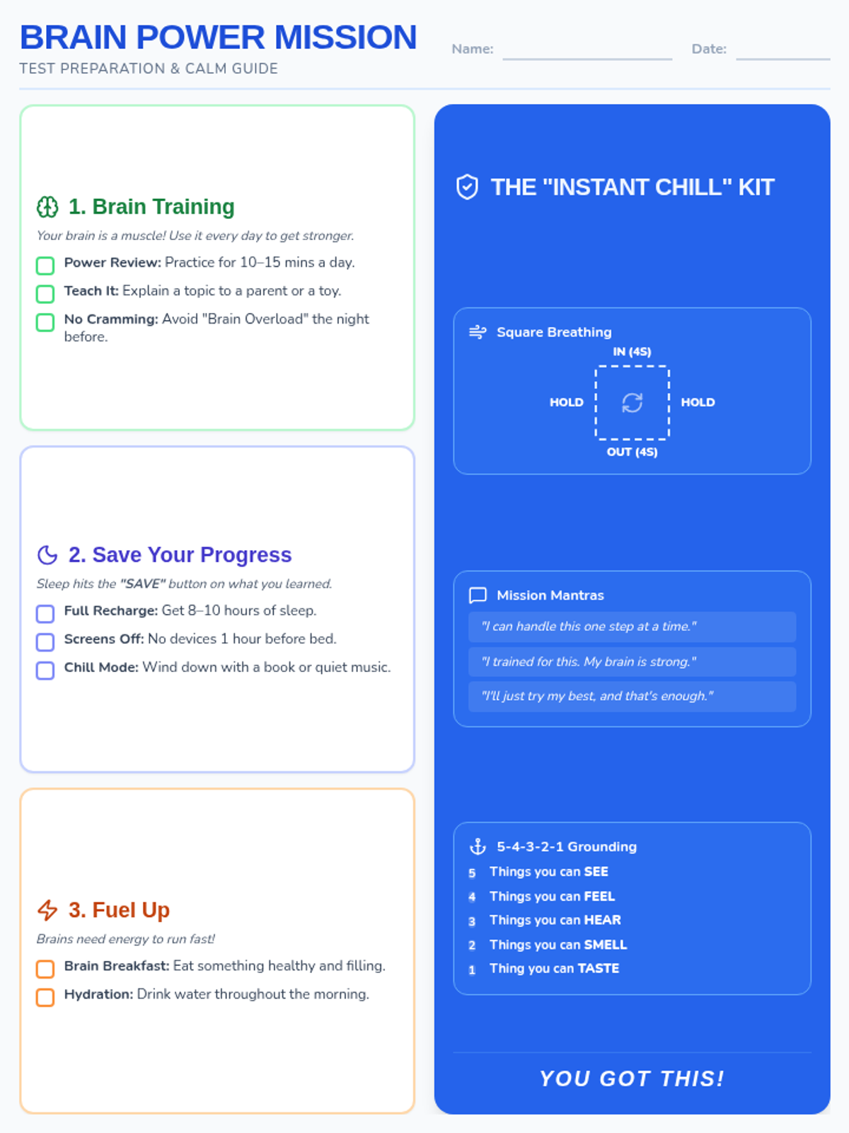 A one-page student handout for grades 3-6 featuring a test prep checklist and "in-the-moment" coping strategies. Updated with "healthy and filling" breakfast tip, 5-4-3-2-1 grounding, and 8-10 hours sleep.