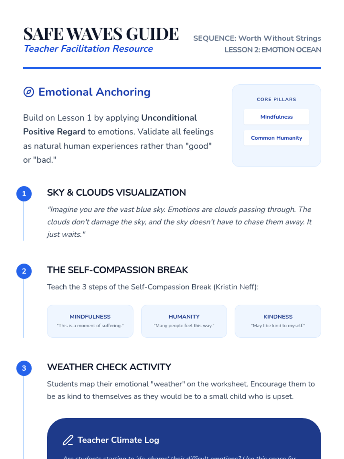 A facilitation guide for teachers on Lesson 2, focusing on the sky/cloud metaphor and teaching the Self-Compassion Break.