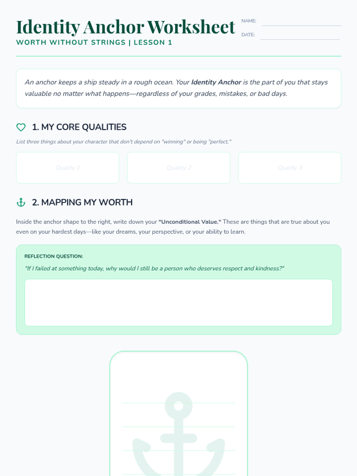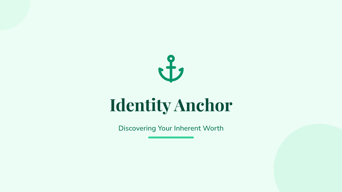 An introductory slide deck for the 'Identity Anchor' lesson, explaining the concepts of intrinsic worth and unconditional positive regard through a 'Botanical Sketchbook' aesthetic.
