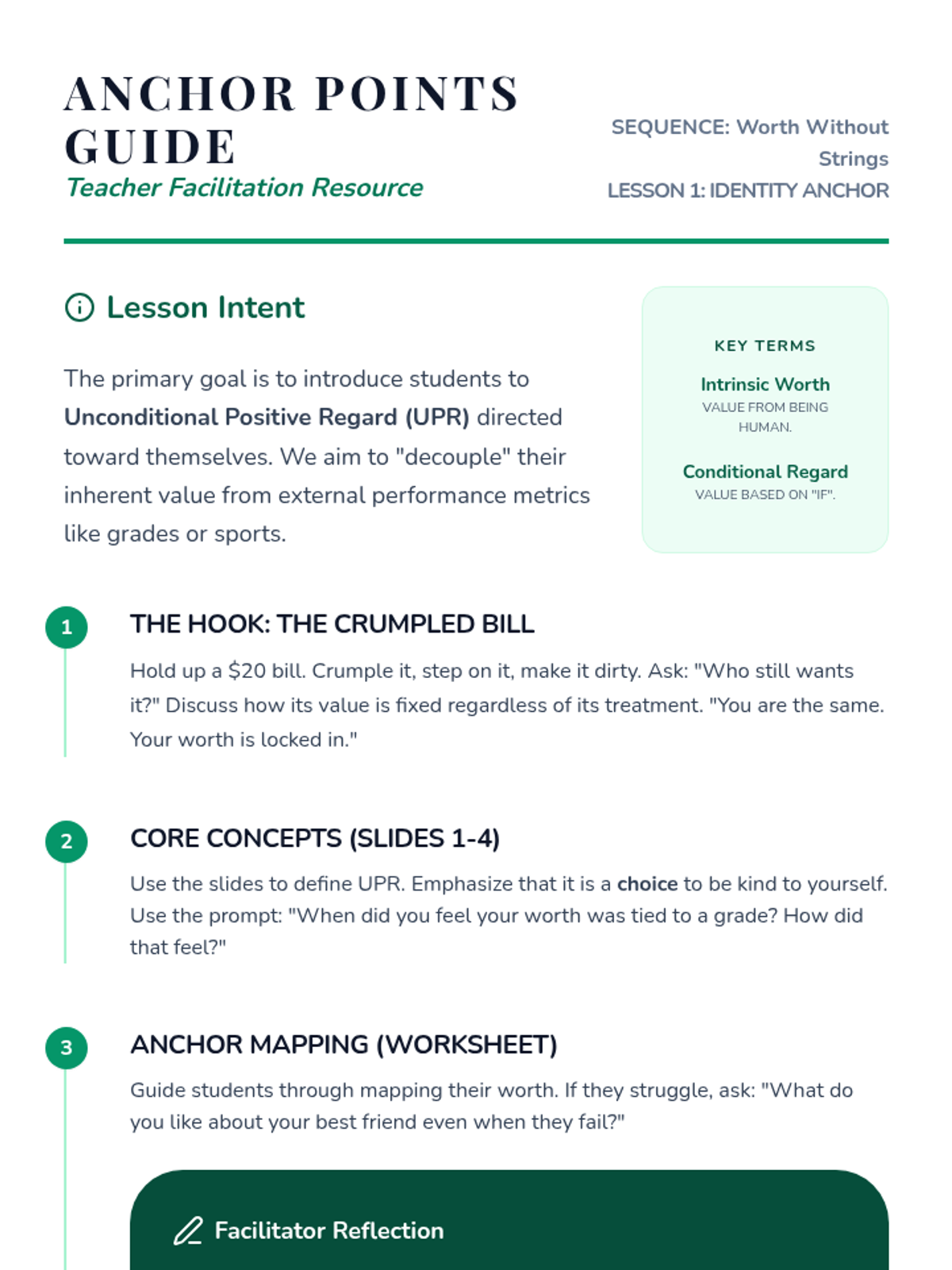 A facilitation guide for teachers to deliver the Identity Anchor lesson, featuring discussion prompts, a 'hook' activity, and support strategies.