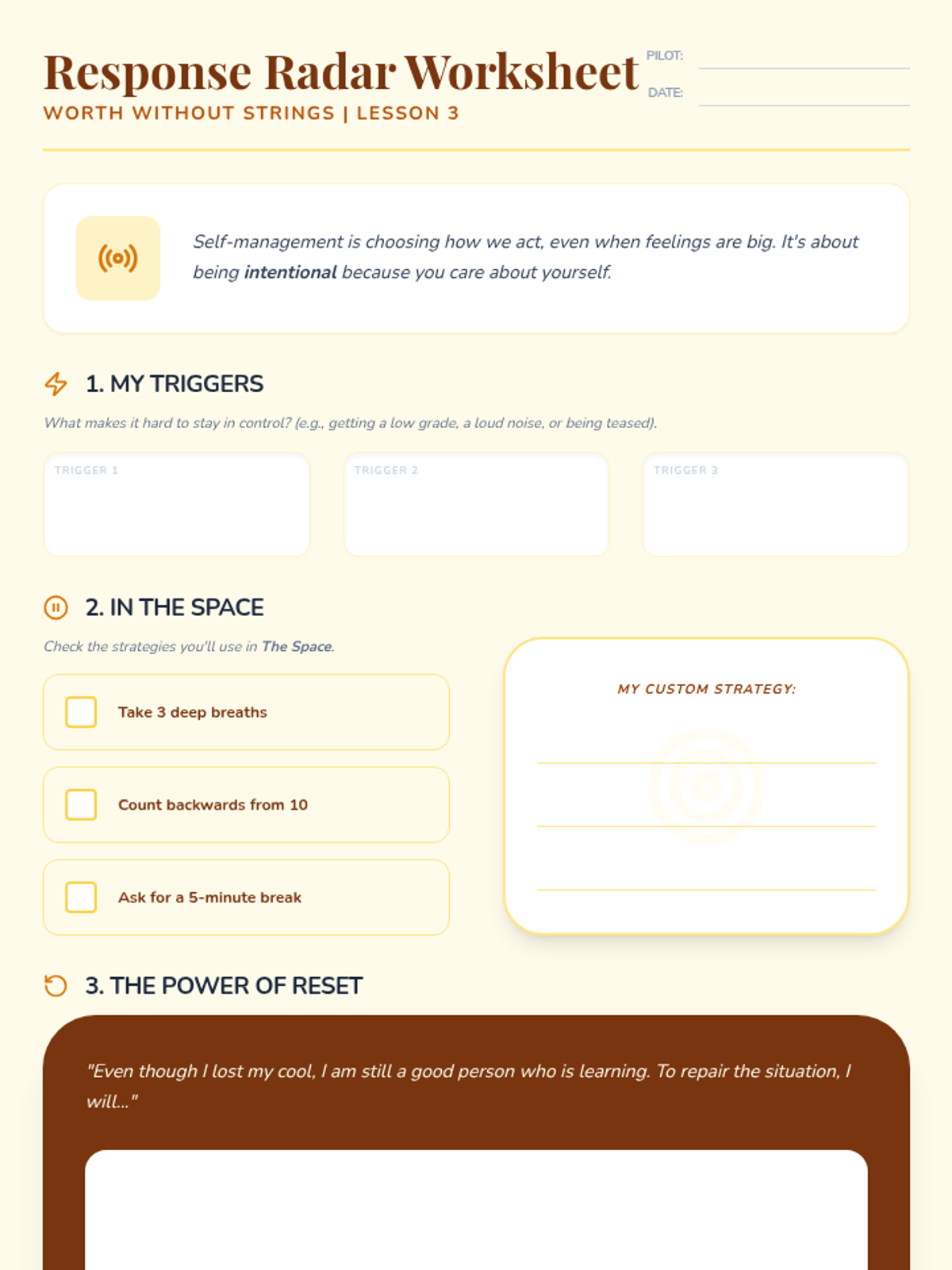 A self-management worksheet for identifying triggers and planning responses, emphasizing the concept of 'The Space' and post-mistake repair.