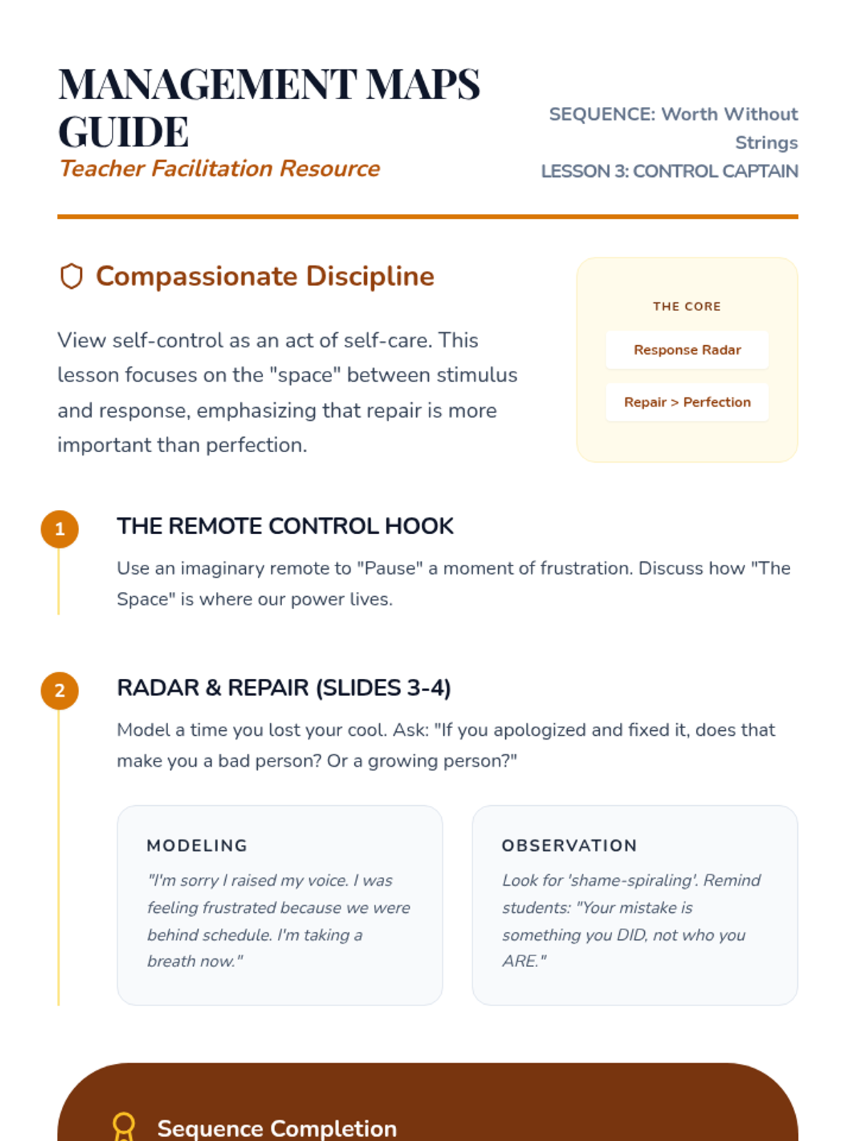 A teacher guide for Lesson 3, providing discussion hooks and the 'Repair Protocol' for teaching self-management with compassion.
