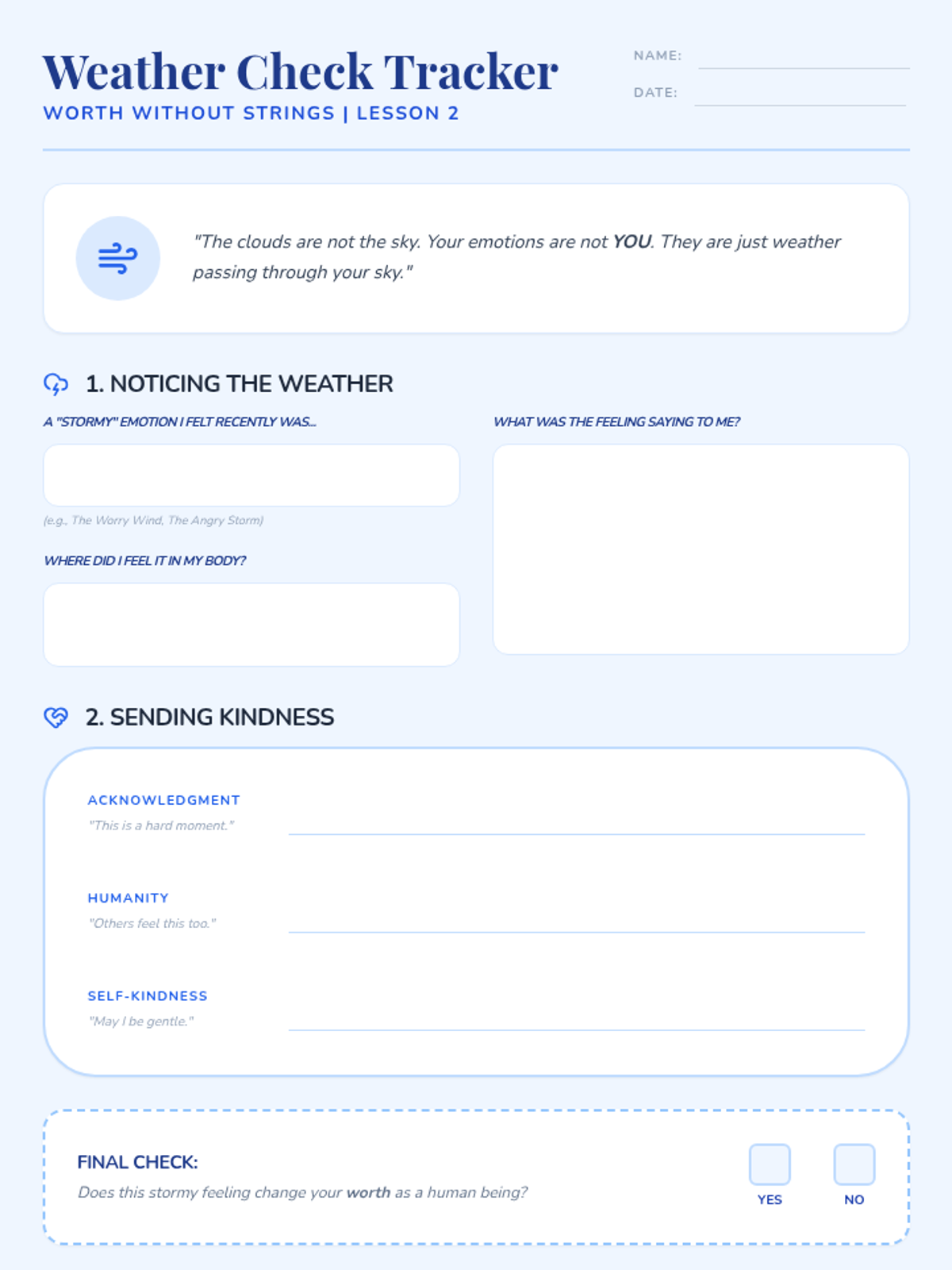 A reflective worksheet for tracking emotional 'weather' and practicing self-compassion scripts, styled with soft blue tones and oceanic motifs.