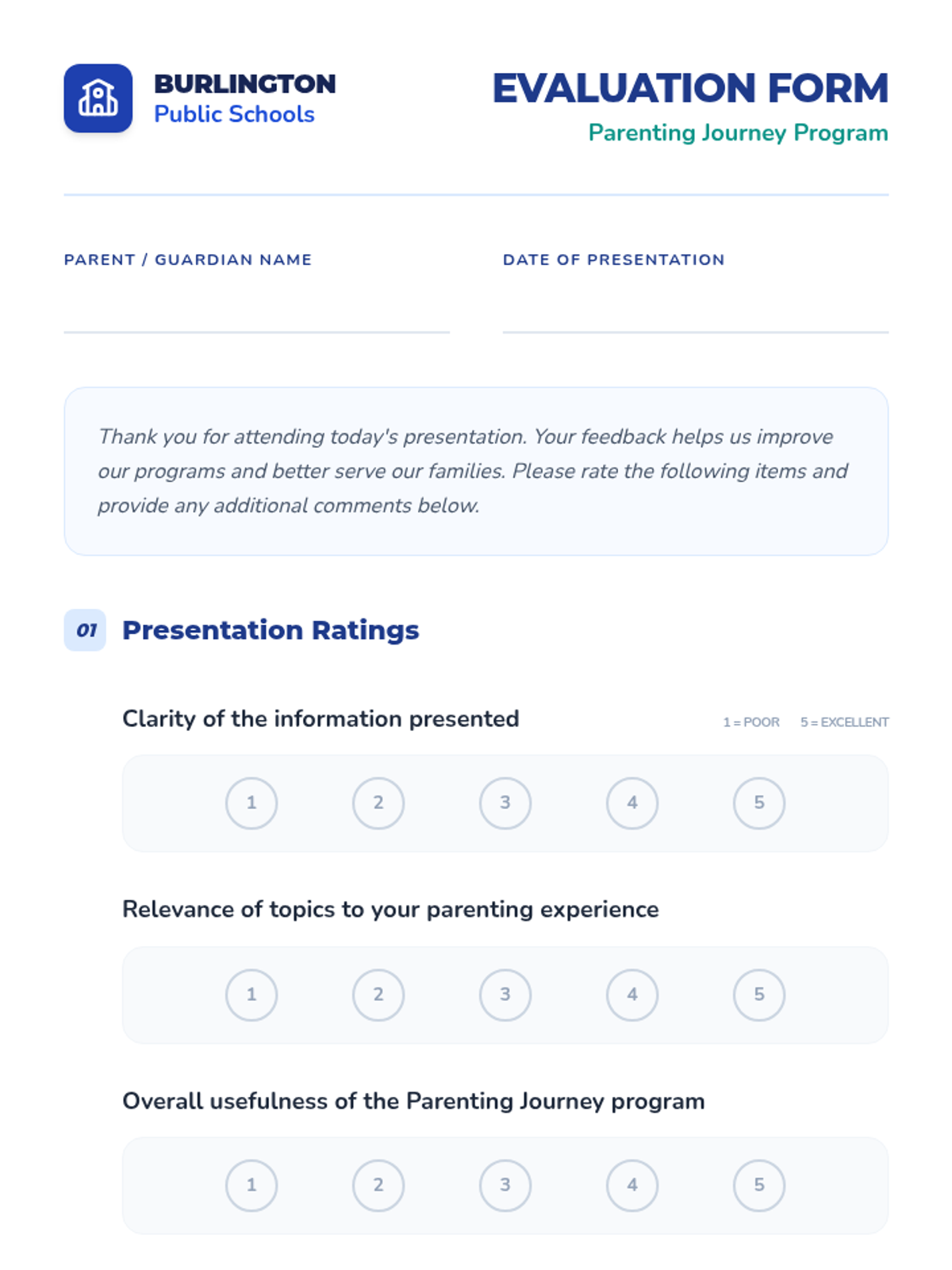 A professional feedback form for parents to evaluate the Parenting Journey presentation, including rating scales and reflection questions.