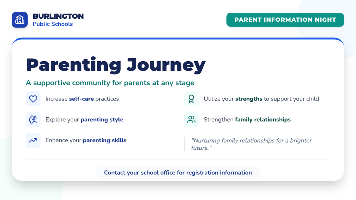 A professional and welcoming presentation slide for Burlington Public Schools' Parenting Journey program, highlighting key benefits for parents at all stages.