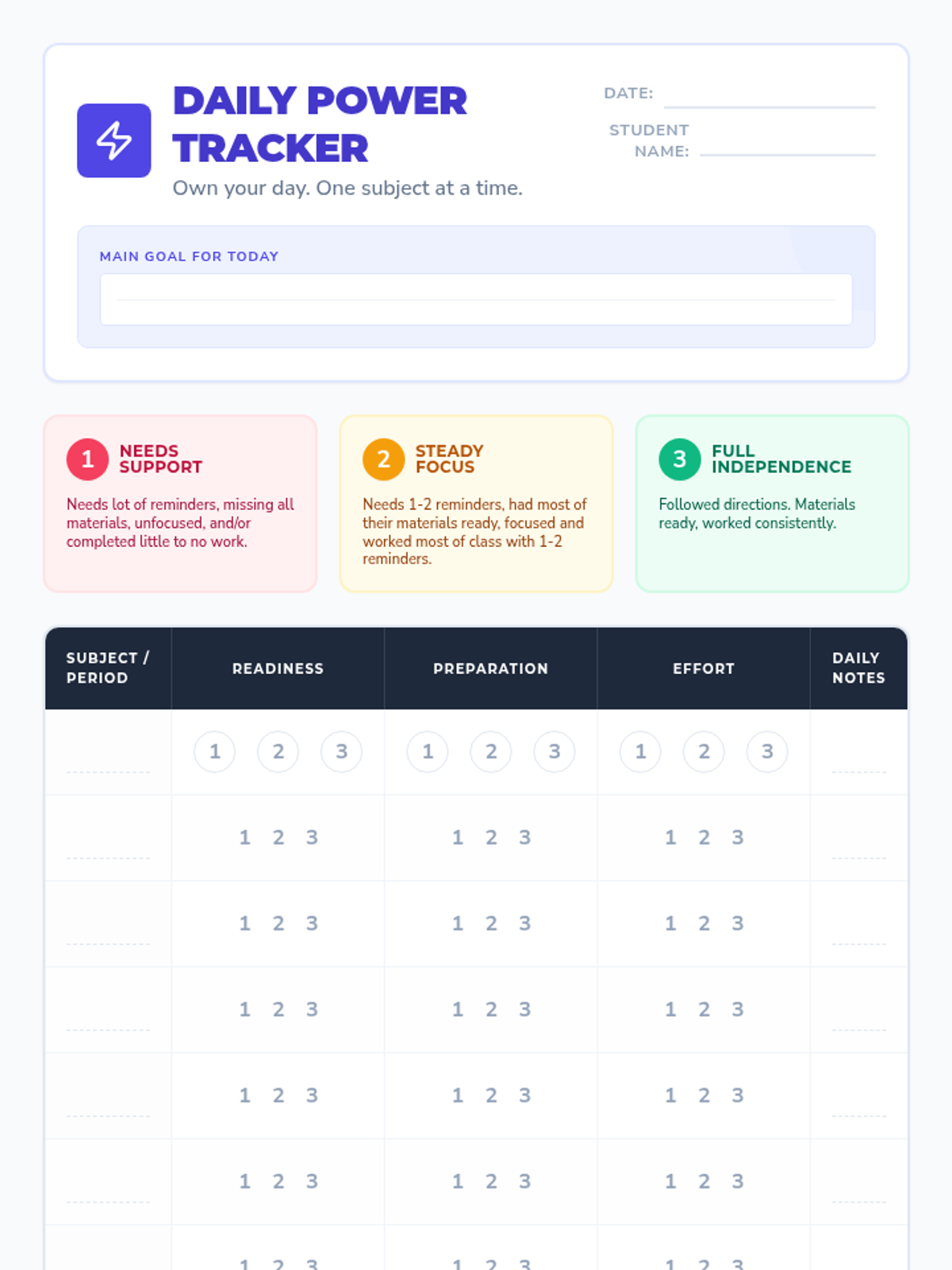 A daily subject-by-subject tracking chart for students to monitor their readiness, preparation, and work effort using a 1-3 scale. Includes a clear legend and space for daily reflections and goals.