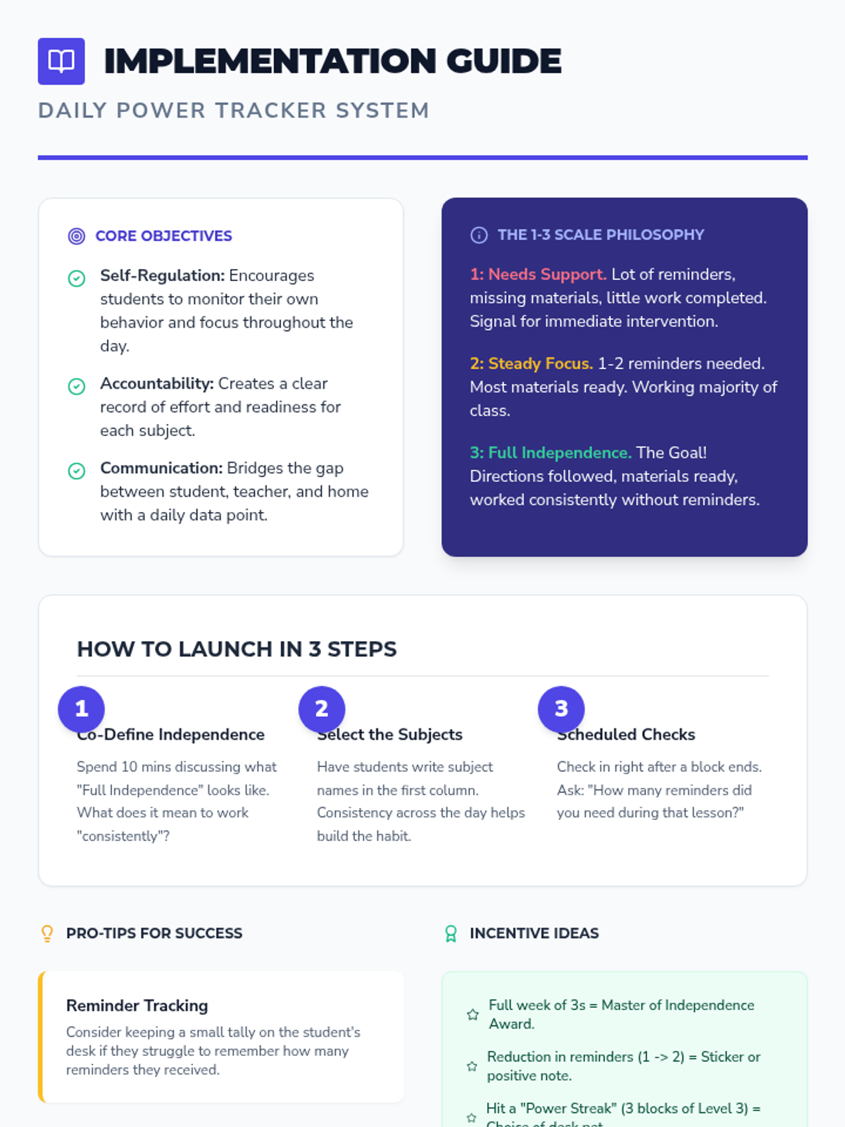 A teacher implementation guide for the Daily Power Tracker, providing strategies for defining levels, scheduled checks, and building student accountability.