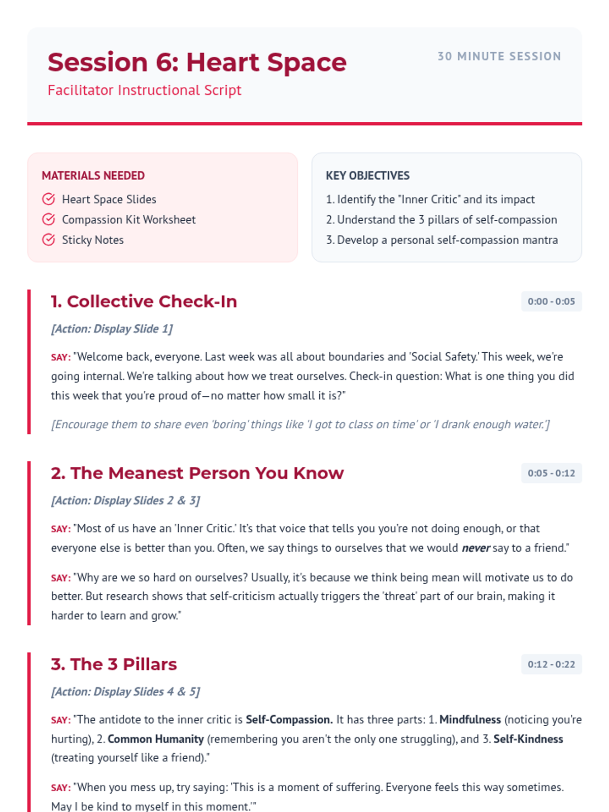 A detailed facilitation script for the sixth session of the Calm Collective, addressing perfectionism, the inner critic, and self-compassion. Fixed icon rendering and page breaks.