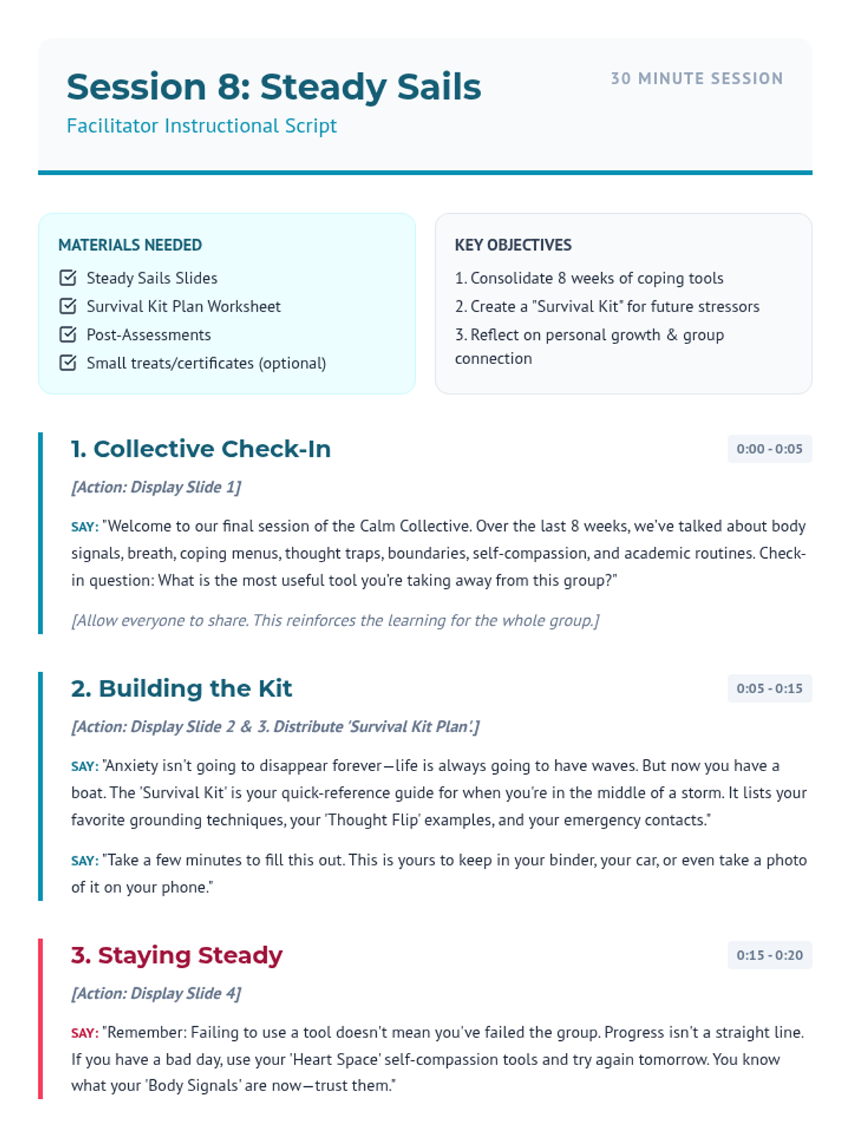 A detailed facilitation script for the final session of the Calm Collective, providing time-stamped sections, "what to say" prompts, and "what to do" instructions for the counselor. Focuses on consolidation and the "Survival Kit."