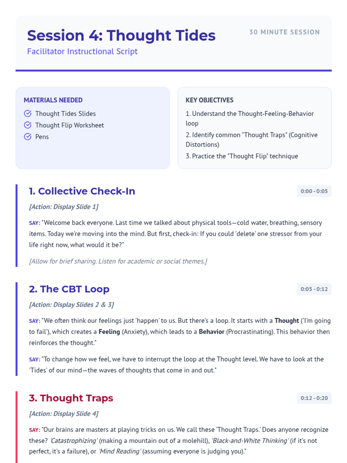 A detailed facilitation script for the fourth session of the Calm Collective, focusing on the CBT loop, identifying thought traps, and practicing cognitive reframing. Fixed icon rendering and page breaks.