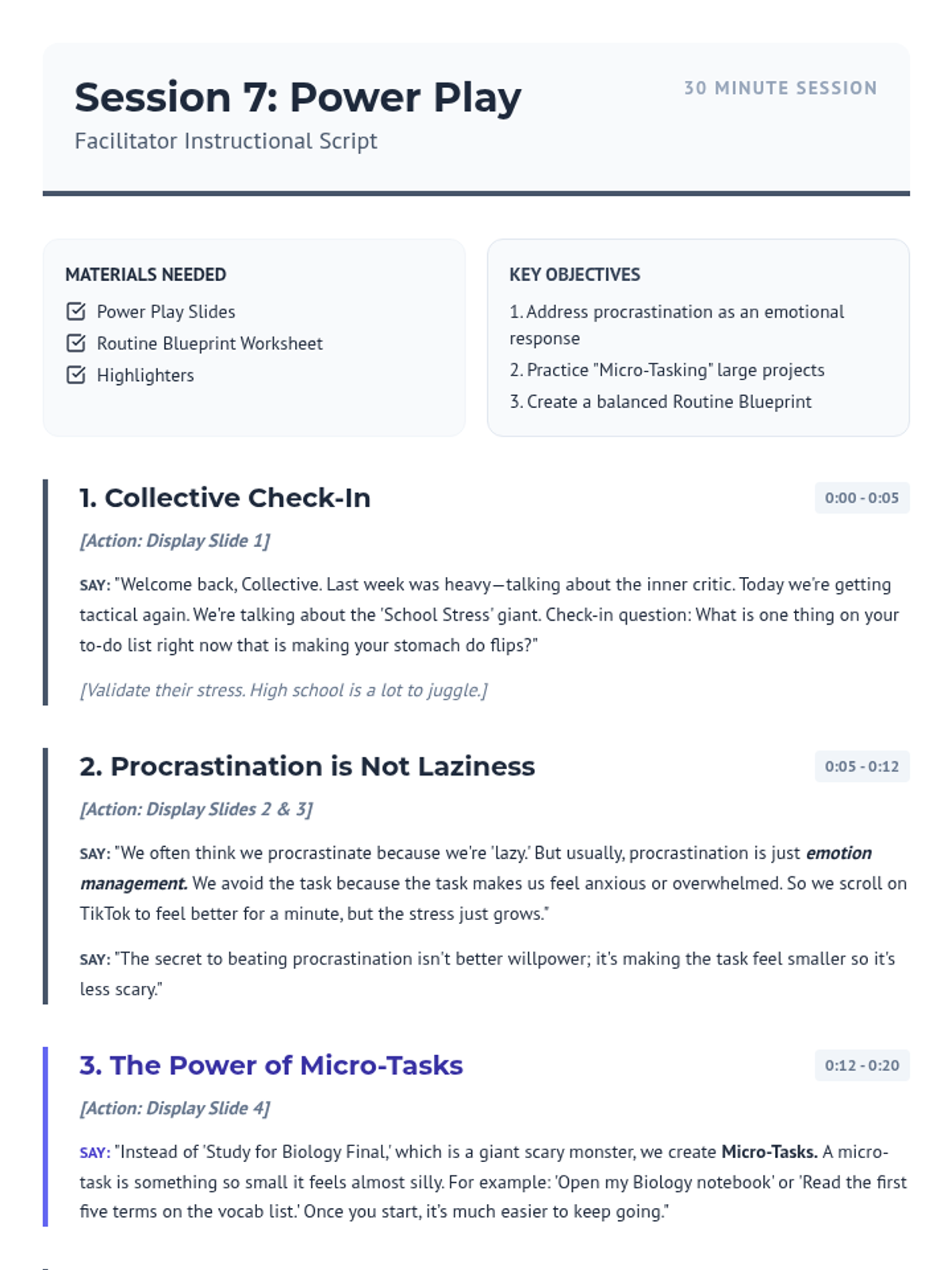 A detailed facilitation script for the seventh session of the Calm Collective, focusing on academic stress management, time-blocking, and overcoming procrastination.