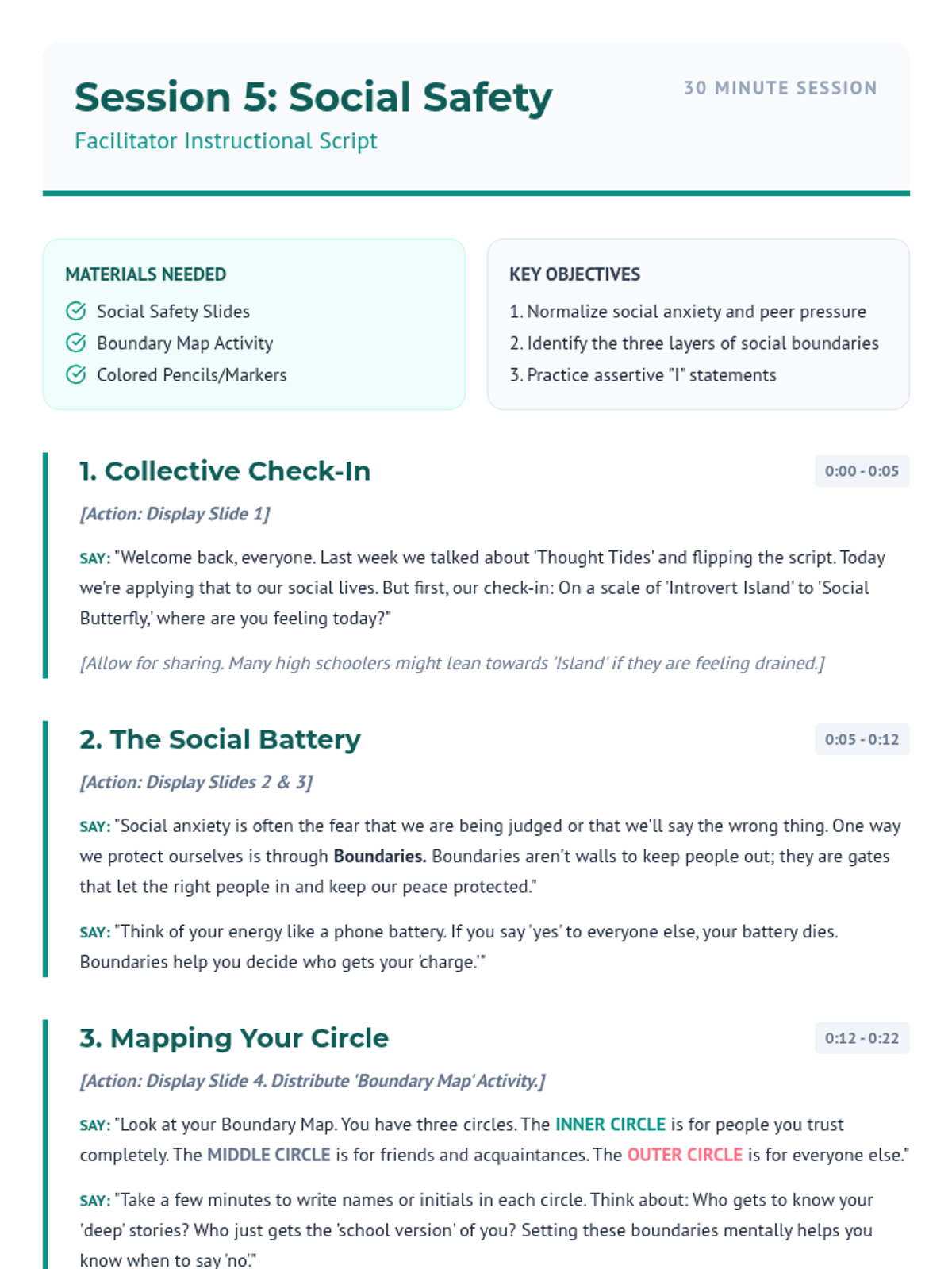 A detailed facilitation script for the fifth session of the Calm Collective, focusing on social anxiety, boundary mapping, and assertive communication skills. Fixed layout overlap and contrast.