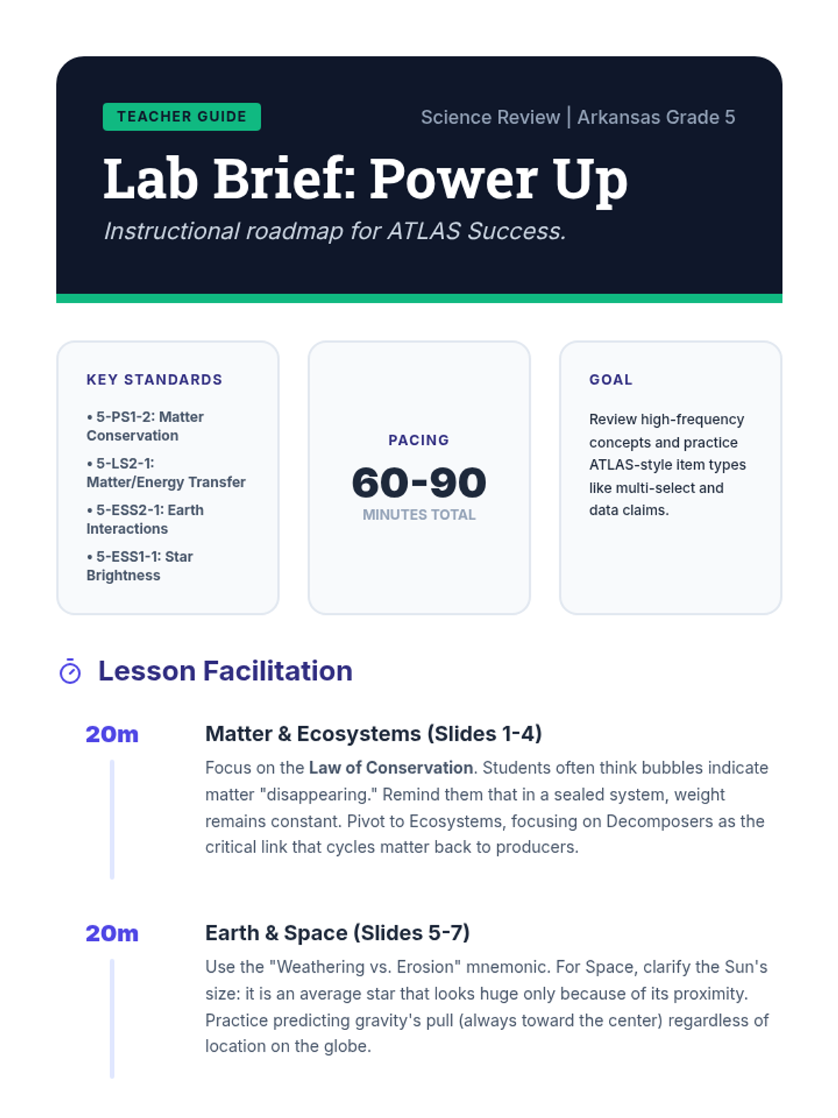 A concise teacher guide for the Science Power Up lesson, providing pacing, standard alignment, and targeted strategies for overcoming common student misconceptions found in Grade 5 ATLAS science testing.