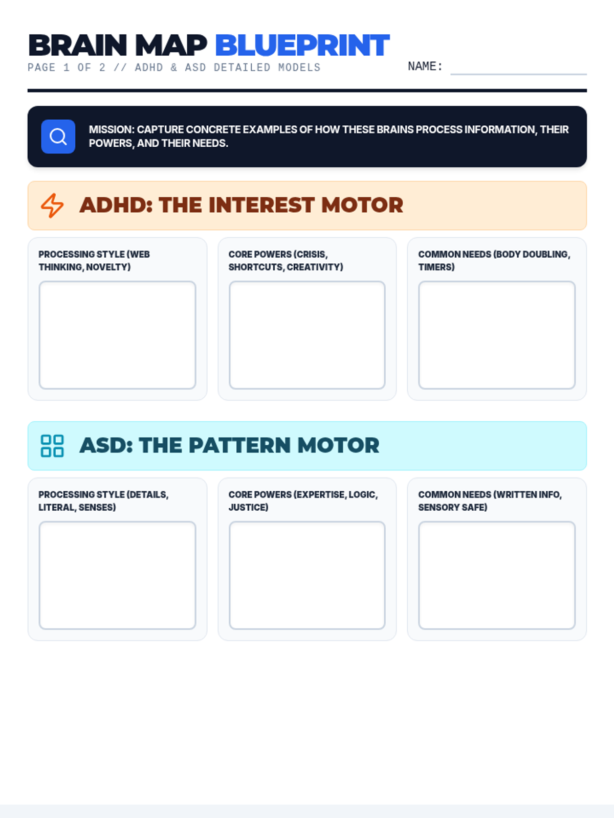 A graphic organizer worksheet designed as a "Brain Blueprint." Students map the processing styles, strengths, and needs of ADHD, ASD, and AuDHD brains. Includes visual prompts and a reflection section for the unique paradoxes of AuDHD.