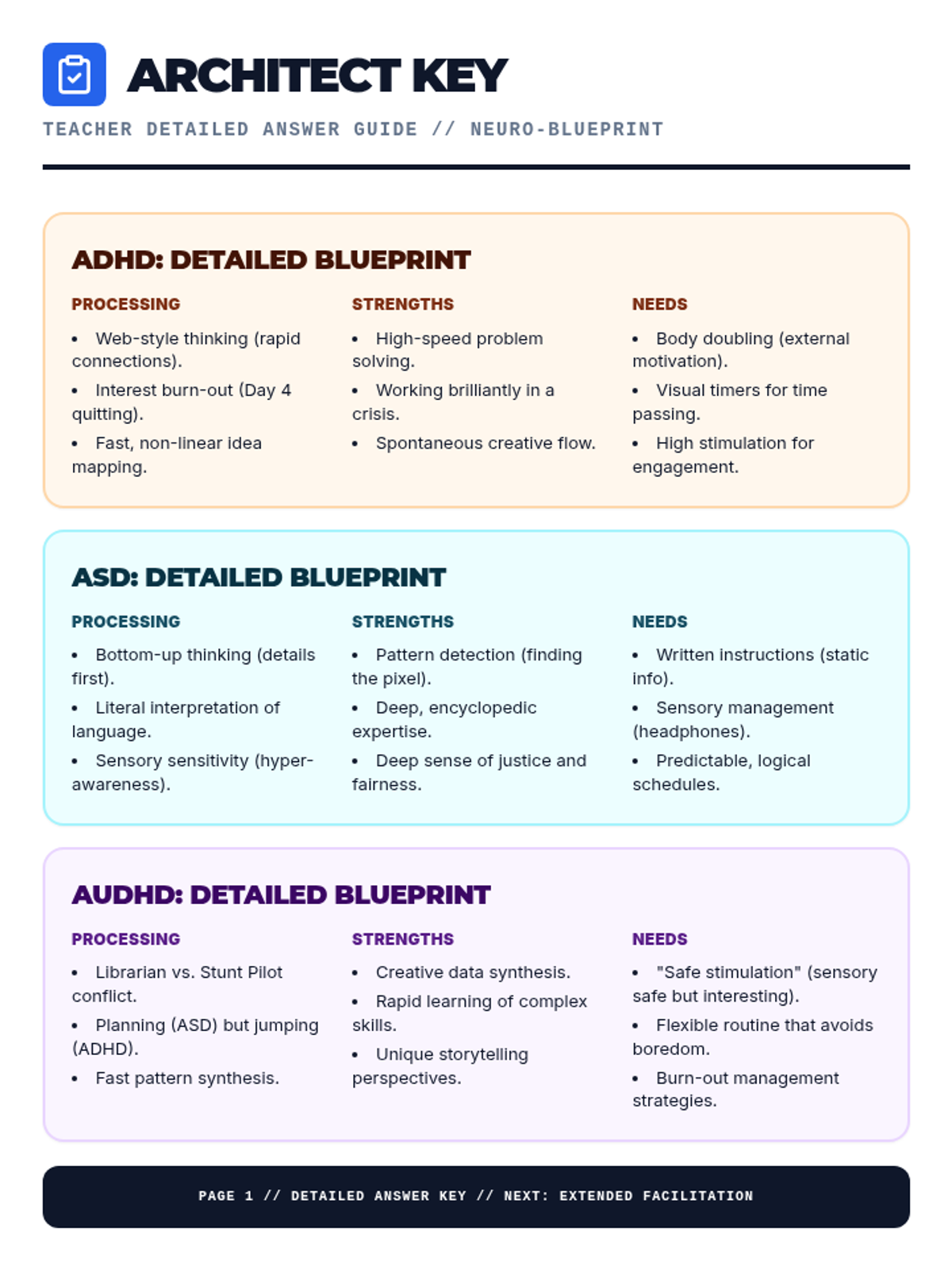 A teacher's answer key and facilitation guide for the Neuro-Blueprint lesson. Includes sample answers for the graphic organizer and tips for explaining the complex AuDHD neurotype to middle schoolers.