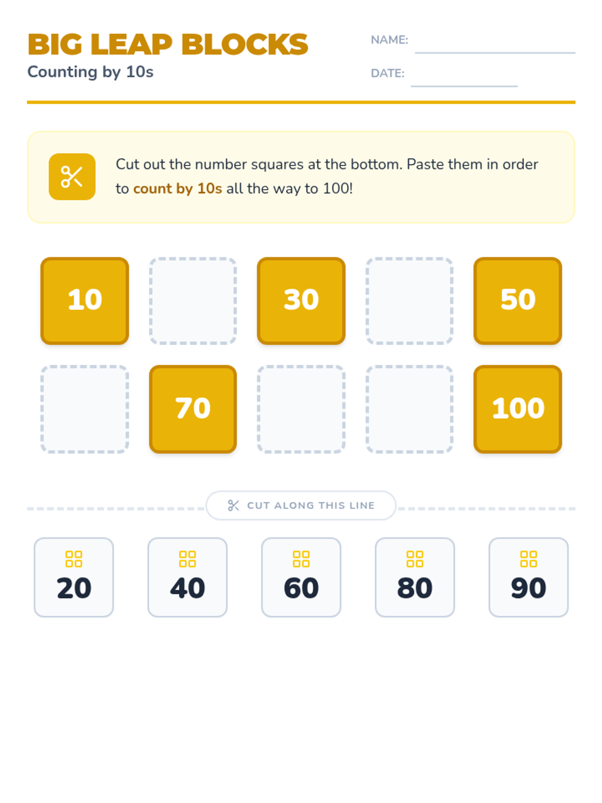 A cut-and-paste worksheet for counting by 10s. Students complete a grid from 10 to 100 by cutting and pasting missing numbers. Uses a structured grid layout to help with spatial organization and sequencing.