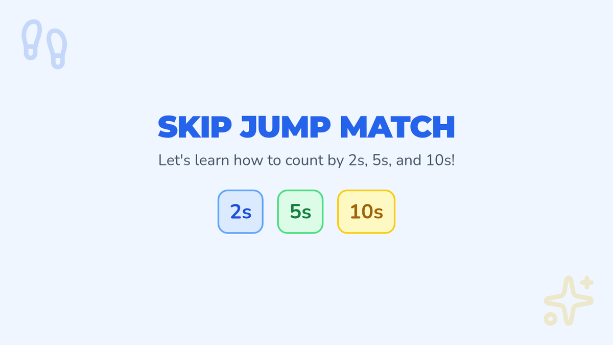 A visual slide deck that introduces skip counting by 2s, 5s, and 10s using relatable visual metaphors like footprints, fingers, and ten frames. Designed for clarity and engagement with high-contrast visuals for IEP students.