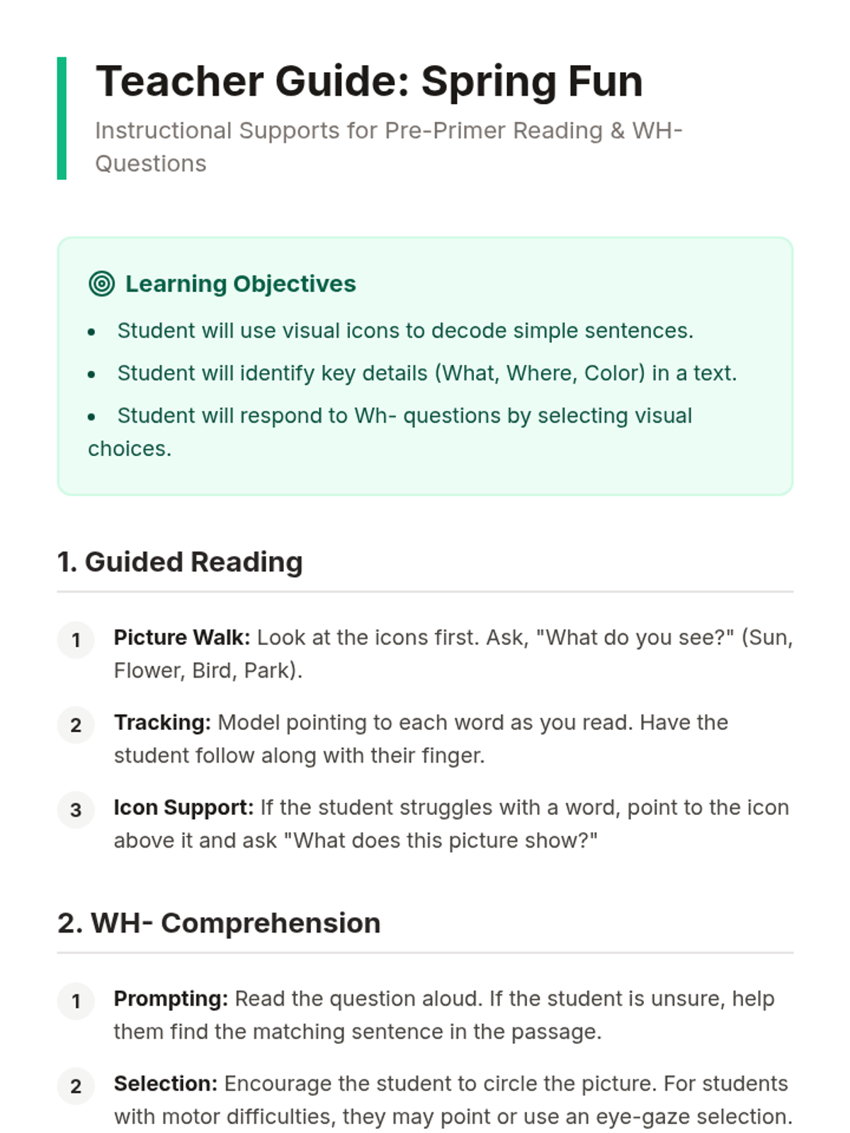 A teacher resource providing instructional strategies, prompt hierarchies, and an updated answer key for the Spring Fun reading activities.