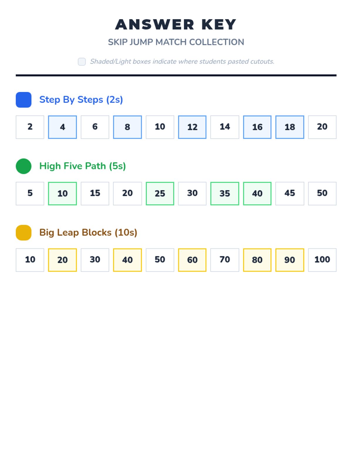 A consolidated answer key for the three skip counting cut-and-paste worksheets (2s, 5s, and 10s). Clearly indicates the correct sequence for each activity to facilitate quick grading.