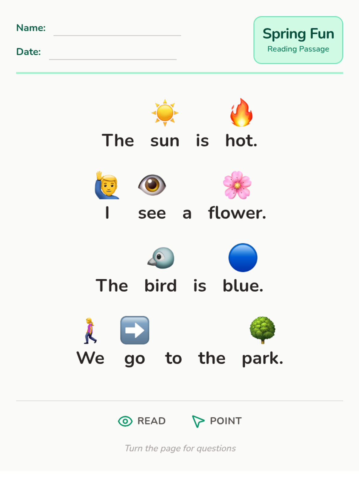 A pre-primer level reading passage about spring, featuring large text and visual icon supports above key words to assist students with decoding and vocabulary.