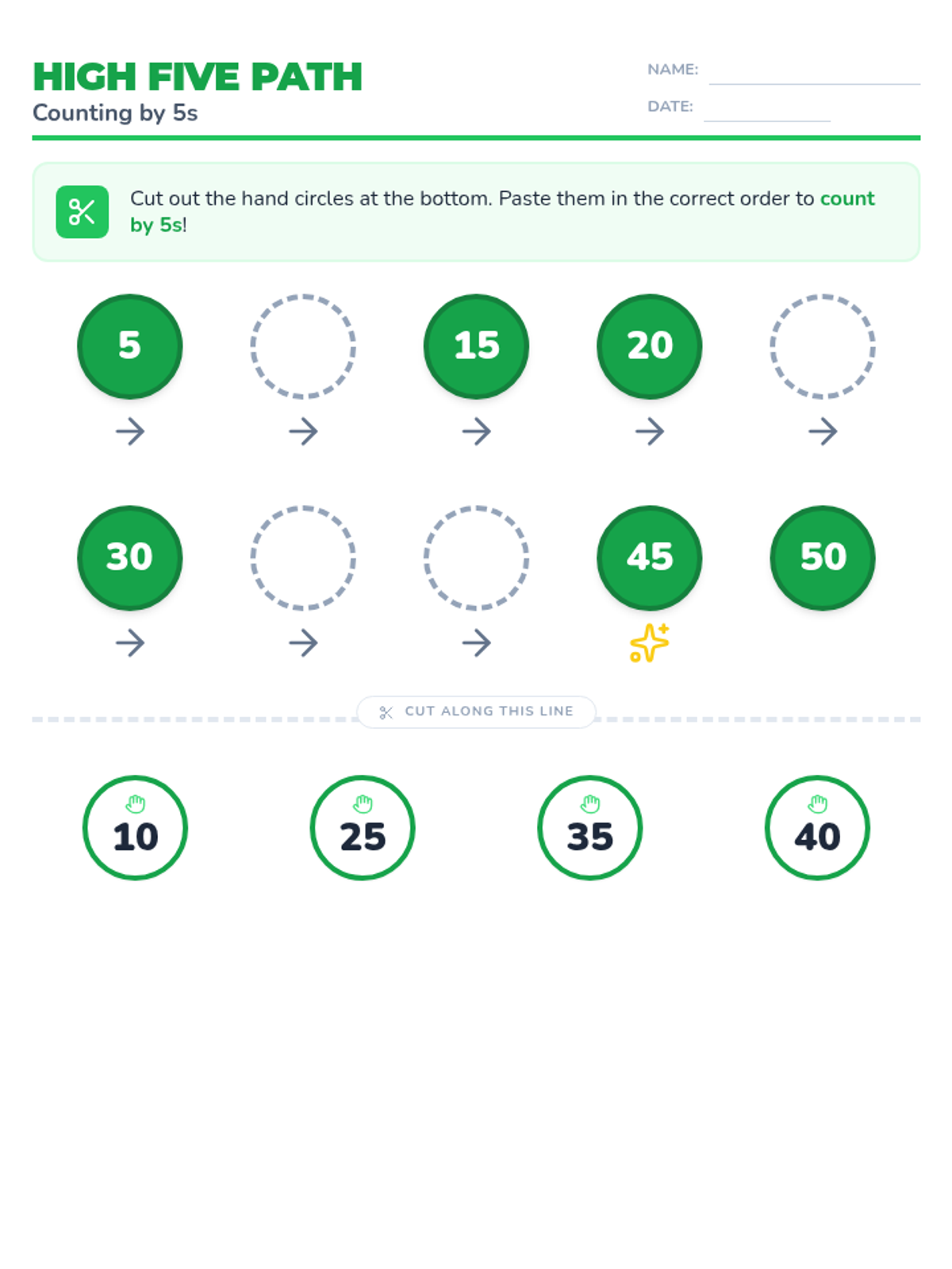 A cut-and-paste worksheet for counting by 5s. Students complete a sequence from 5 to 50 by cutting out hand-themed circles and pasting them in order. Features large, accessible shapes and clear visual markers.