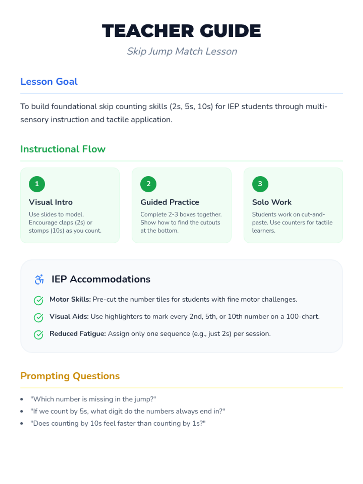 A comprehensive teacher guide for the Skip Jump Match lesson. Includes lesson goals, pacing suggestions, specific IEP accommodations, and discussion prompts to facilitate learning for students with diverse needs.