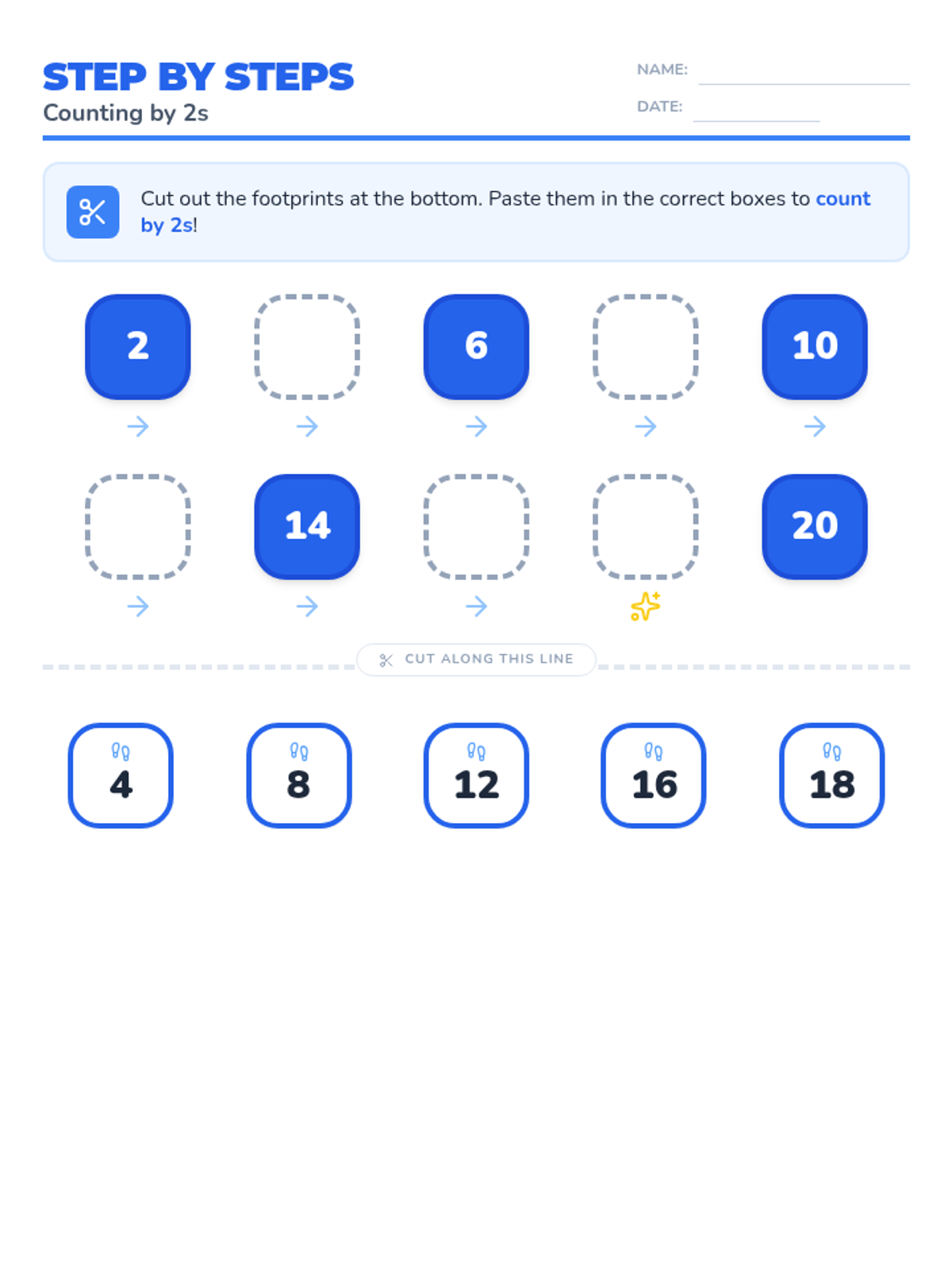 A cut-and-paste worksheet for counting by 2s. Students complete a sequence from 2 to 20 by cutting out footprints and pasting them in the correct order. Includes visual cues and clear instructions.